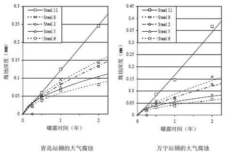 为此,武汉钢铁〔集团)公司与青岛海洋腐蚀研究所、武汉材料保护研究所等站网成员单位共同研制、开发新型经济耐候钢显着提高碳素结构钢的耐大气腐蚀性能,已生产的钢种为JN235、JN255、JN345.根据试验结果,这些钢的成本相当于碳素钢,但耐大气腐蚀性能却相当于Cor-Ten B钢,比碳钢提高1.5倍。这些钢种已列入武钢销售产品目录中。