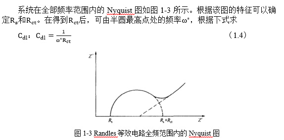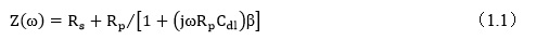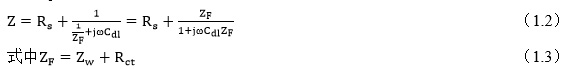 图1-1(b)等效电路由溶液电阻Rs、双层电容Cd1、电荷转移电阻Rct和Warburg阻抗Zw成。包括活化过程和传质过程的阻抗称为Faraday阻抗ZF,它由Rct和W串联而成,因此等效电路的总阻抗Z为: