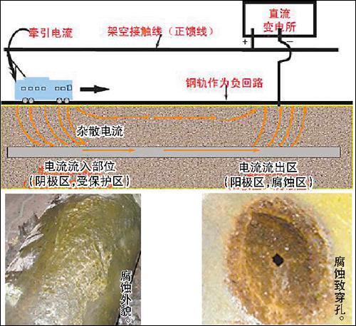 杂散电流腐蚀是继大气腐蚀、土壤腐蚀和细菌腐蚀后又一种腐蚀类型。市安监局相关工作人员解释,牵引地铁的电流,从车顶的接触网向列车输送,再通过铁轨和导线返回变电站。在设计或规定的回路以外流动的电流,就是杂散电流。为什么会有杂散电流?由于运营环境、经济及其他方面因素的限制,列车轨道不可能完全与大地绝缘,电流从沿线地下的隧道、管道等金属和土壤回流到变电站,形成杂散电流。
