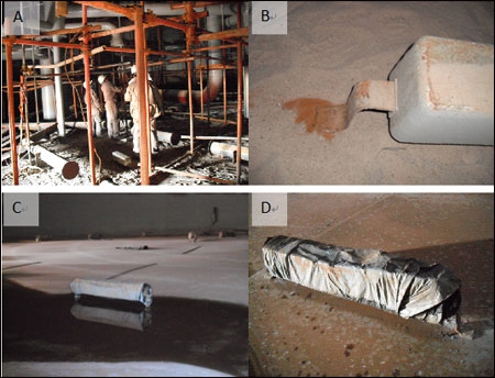 在现场施工过程中由于对防腐手段的原理不了解也很容易形成一些错误做法。如图3所示,在储罐内部施工阶段底板上的牺牲阳极过早安装。在对罐内进行内防腐喷涂过程并没有对这些阳极进行保护,造成阳极表面形成漆膜,如图3(A)、(B)所示。但在大罐充水沉降时反而将牺牲阳极用塑料布缠裹,使其无法发挥牺牲阳极的作用,失去对储罐的保护,如图3(C)、(D)所示。