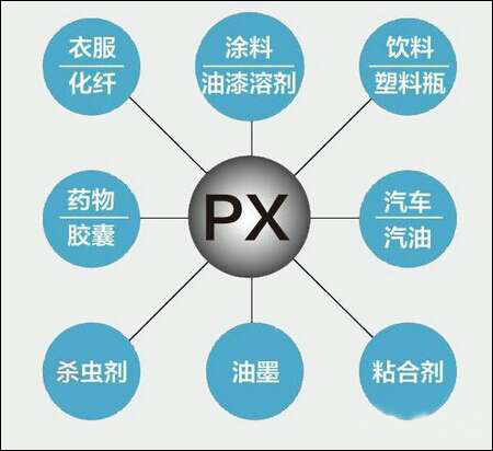 PX (PX是对二甲苯(para-xylene)的简写) 与人们生活的各个方面息息相关,它是石油化工产业链中的中间产品,是生产涤纶纤维的原料,是纺织服装、塑料制品等日用消费品生产的上游中间原料之一。随着技术的进步,PX的下游产品正在越来越多地取代铝、玻璃、陶瓷和纸张,应用于电器电子、汽车及机械制造行业。PX的用途十分广泛,市场需求巨大,利润也高。因此,很多企业先后引进和发展PX项目。