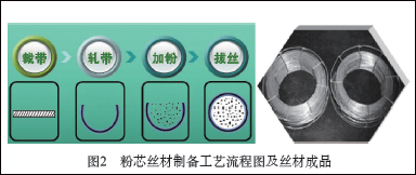 调研发现,在Zn-Al合金涂层中添加少量的Mg和RE能进一步提高涂层的耐蚀性能。Mg的作用是形成尖晶石氧化膜改善涂层中Al的阴极保护作用,出现“自封闭”现象大大提高了其在盐雾腐蚀环境下的耐“点蚀”性能;RE元素能细化涂层微观结构,减少喷涂层的孔隙率,并对涂层具有一定的强化作用。但由于受到实心材料拉拔工艺的限制,无法获得高Al(含量大于15%时)、Mg含量的喷涂丝材。针对海洋环境下工程设施的长效防腐问题,创造性地采用粉芯丝材制备技术(如图2所示),解决了上述技术“瓶颈”,填补了我国在该研究领域的空白。