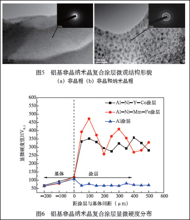 揭示了铝基非晶纳米晶复合涂层微观结构对其防腐、耐磨性能的影响机制。指出涂层中存在非晶具有优异的防腐、耐磨性能的;弥散分布于非晶中的纳米晶相起到了性能强化作用,使整体涂层具有较高的硬度和良好的耐磨损性能;在腐蚀介质中,纳米晶粒具有较大的比表面能,可促进钝化膜的生成,有利于提高涂层的耐腐蚀性能。非晶与纳米晶相的结合,使得该系列涂层同时具备防腐与耐磨功能。