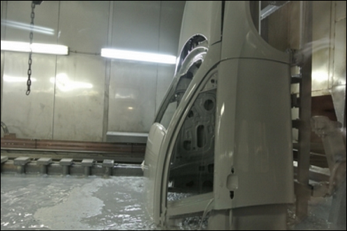 电泳槽液参数及电泳温度、时间、电压都是影响电泳质量的主要原因。电泳温度过高、时间过长、电压过高会造成漆膜过厚,影响驾驶室表面的平整,反之则会成膜不够,影响其防腐蚀性;颜基比、电导率以及槽液pH等参数的偏离则会造成电泳膜粗糙,影响驾驶室的防腐蚀性。因此做好电泳参数调整是保证电泳质量的主要原因。电泳后用超滤液洗净被涂物表面的浮漆,提高漆膜外观质量。