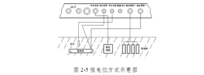 (2)强制电流保护法 将被保护金属与外加电源负极相连,由外部电源提供保护电流,以降低腐蚀速率的方法。其方式有:整流器、恒电位、恒电流、恒电压等。如图2-5示。