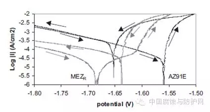 对于活性溶解行为的材料(镁合金、碳钢、低合金钢等)来说,仅仅采用腐蚀电位(Ecorr)的高低来评价材料的腐蚀性能是不对的。这种错误的认识来源于仅仅关注了材料腐蚀的热力学趋势,而忽略了材料的腐蚀动力学特征。在评价活性溶解材料的耐蚀能力时,首要的参数是腐蚀电流(icorr),腐蚀电流越小,材料的耐蚀性能越好,这是因为腐蚀电流是由材料的溶解所造成的。AZ91E和MEZ两种镁合金的极化曲线如图7所示,从图中可以看出:尽管MEZ合金的腐蚀电位远远低于AZ91E合金,但是考虑到MEZ合金的腐蚀电流要明显小于AZ91E合金,所以MEZ合金的耐蚀性能应当高于AZ91E合金,这一点从盐雾腐蚀失重和金相观察结果中都得到了证实。