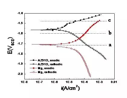 只要当两种材料的腐蚀电流大体相同时,腐蚀电位才是一个需要考虑的参数,腐蚀电位越高,材料的耐蚀性能越好。举一个例子可以有助于更好的理解这句话,图8:当电位为a时,纯镁处在腐蚀电位,纯镁发生腐蚀;而AZ91D镁合金则处在阴极状态,没有发生腐蚀。当电位为b时,纯镁处在阳极电位而发生严重的腐蚀;与之对比,AZ91D镁合金则还处在阴极状态,没有发生腐蚀。当电位为c时,纯镁和AZ91D镁合金都处在阳极电位下,但是AZ91D镁合金的阳极电流则明显小于纯镁,此时AZ91D的腐蚀速度低于纯镁。从上述的三种典型的情况来看,AZ91D合金在各个电位下其溶解电流都小于纯镁,所以可以判断AZ91D合金的耐蚀能力优于纯镁。