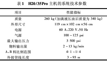 H20/35Pro主机采用对置活塞计量泵,可以消除工作时的不均匀负载,可延长密封件的寿命,整体型的泵底座可以确保在泵循环过程中压力的稳定性,从而提供非常稳定的喷涂型式和灌注应用时可靠的重合性。同时,H20/35Pro主机的软管加热和自动温控系统加热能力强、预热快,由靠近枪的淹没在原料流中的温度传感器来自动控制温度,可精确控温。表1为H20/35Pro主机的系统技术参数。表1中,1psi=6.89kPa.