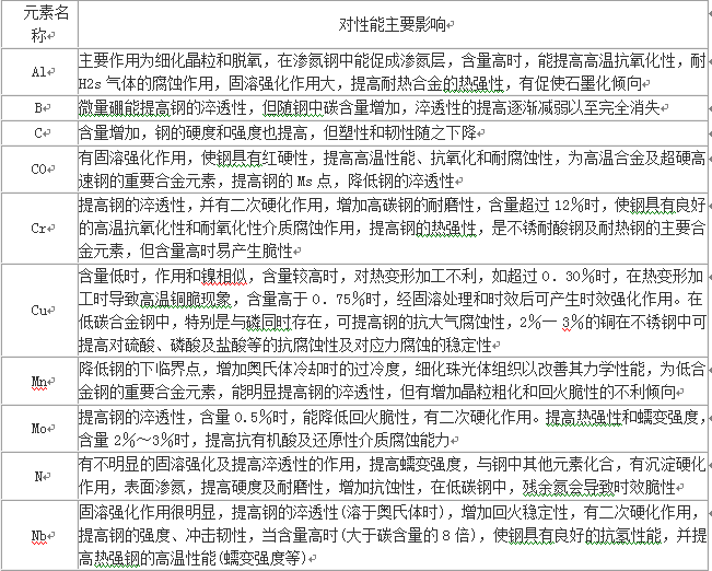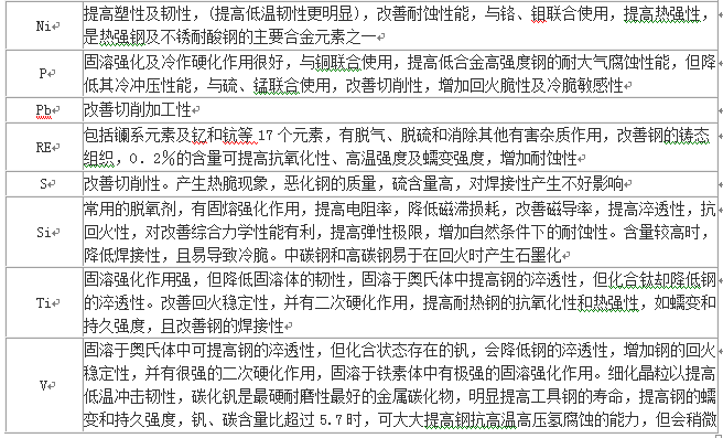 目前在合金钢中常用的合金元素有:铬(Cr),锰(Mn),镍(Ni),硅(Si),硼(B),钨(W),钼(Mo),钒(V),钛(Ti)和稀土元素(Re)等。五大元素:硅、锰、碳、磷、硫。五大杂质元素:氧、氮、磷、硫、氢。