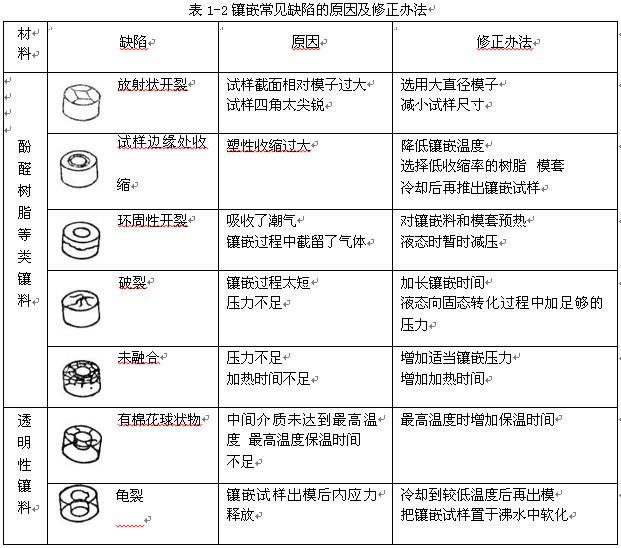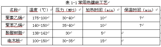 嵌料常用的有酚-甲醛树脂、酚-糠醛树脂、聚氯乙烯、聚苯乙烯前两种主要为呈热凝性 的材料,后两种为热塑性材料,并呈透明和半透明性。在酚-甲醛树脂内加入木粉,即常用 的所谓“电木粉”,它可以染成不同颜色。常用热镶嵌工艺见表 1-1,热镶嵌中会碰到一些 缺陷,这些缺陷的成因、补救办法见表 1-2。