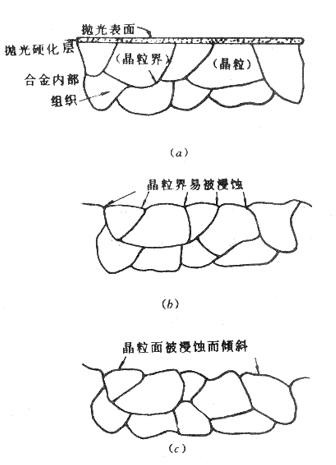 极表面产生选择性溶解,逐渐使表面凸起部分被溶解,而获得平整的表面(即被抛光)。此 法目前应用渐广,因为它速度快且表面光洁,抛光过程中不会发生塑性变形(机械抛光不不 可避免地发生塑性变形层,影响显微分析结果;有时要反复抛光、腐蚀才能把变形层除去)。 其缺点是工艺过程不易控制;
