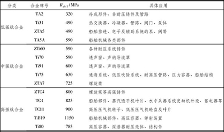 中国船用钛合金的研究与应用始于 20 世纪 60年代,经过几十年的发展,已形成较完整的船用钛合金体系,能够满足舰艇、潜艇和深潜器对不同强度级别的要求。应用领域涉及船体结构、推进系统、电力系统、电子信息系统、辅助系统、特种装置等。按屈服强度等级划分,即屈服强度在 490 MPa 以下为低强钛合金,具有优异的塑性;490 ~ 790 MPa 为中强钛合金,高于 790 MPa 为高强钛合金,主要用于船舶动力工程中的耐热耐蚀部件和船舶特种机械等。