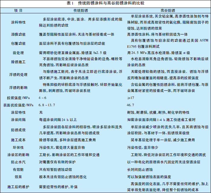 传统防锈涂料有其优势和特点,亮谷防锈涂料也有独到之处,表1 从特性施工效果等很多方面进行了比较,显示了其差别。