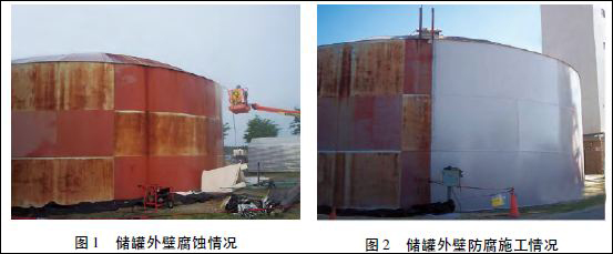 某石油公司5 000 m3 汽油罐外部腐蚀严重( 见下图1,2) ,经过调查选用该涂料,施工过程简单,只是除去罐体表面的浮锈等,然后喷涂( 见图2) ,施工完成后,检验合格,固化后投入使用,效果良好。5 结语该防腐漆固化后形成了一层具有优越的粘着性和弹性的保护膜,具有耐磨损及耐撞击性。使用寿命可达十年以上。可广泛应用在石油开采炼化、海洋石油、火力发电、铁路运输、车辆和车辆制造、船舶和造船、广电钢塔、水利枢纽、天然气和石油管道、化工工业、机械制造、军事装备等行业的金属、混凝土、木材、玻璃纤维、砖墙、含铅涂料的防腐和封装等。