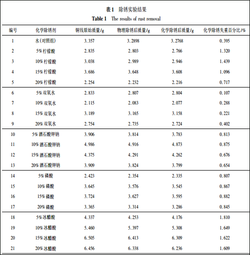 将除锈后的铜钱洗净,晾干,记录下每个铜钱在化学除锈后的重量。用失重法计算实验结果,得出不同化学除锈剂的除锈强度。
