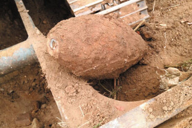 挖掘机修建河渠竟挖出炮弹 弹筒已被腐蚀