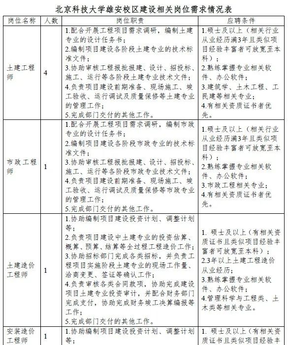 岗位详情:详见《北京科技大学雄安校区建设相关岗位需求情况表》