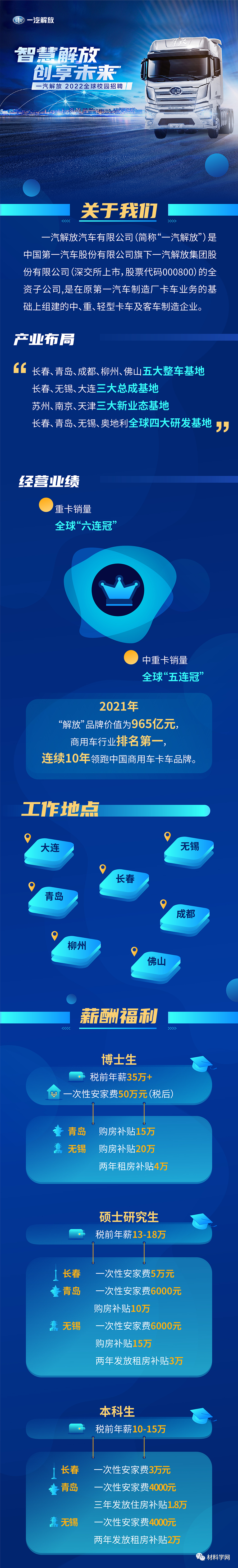 【招聘】博士年薪35万+,安家费50万:一汽解放2022年招聘材料类毕业生!