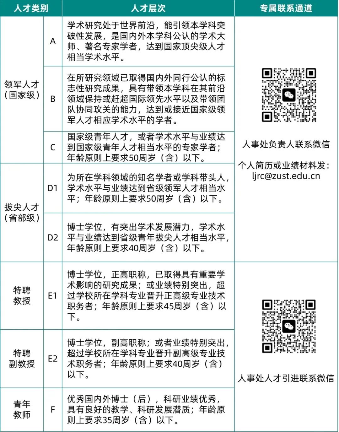 学校高度重视省部级以上人才,开辟了高层次人才引进专属通道:ljrc@zust.edu.cn,您可将个人简历和主要科研业绩发送至该邮箱,我们会第一时间与您联系,邀请来校或上门拜访商谈“一事一议”的引进政策。