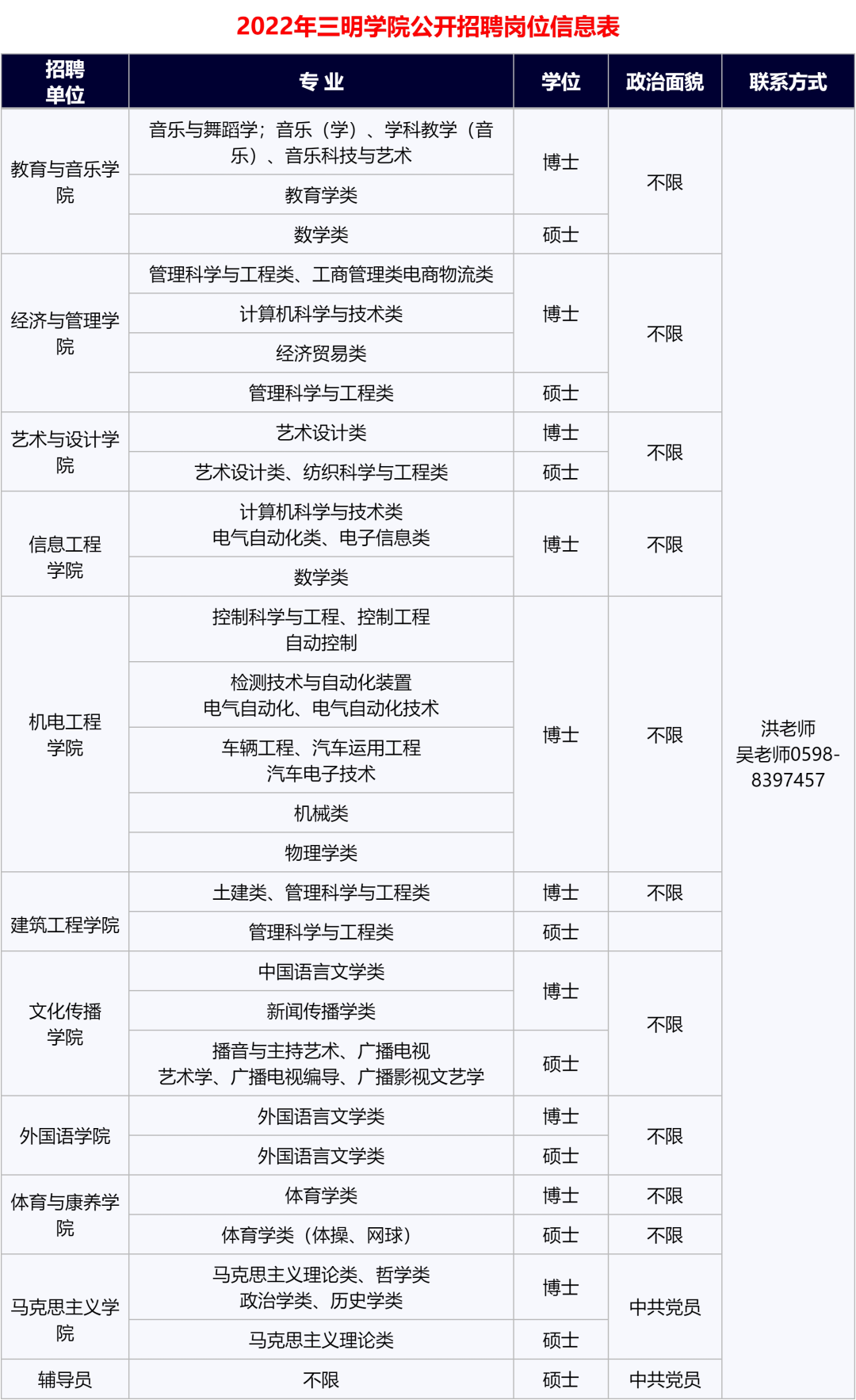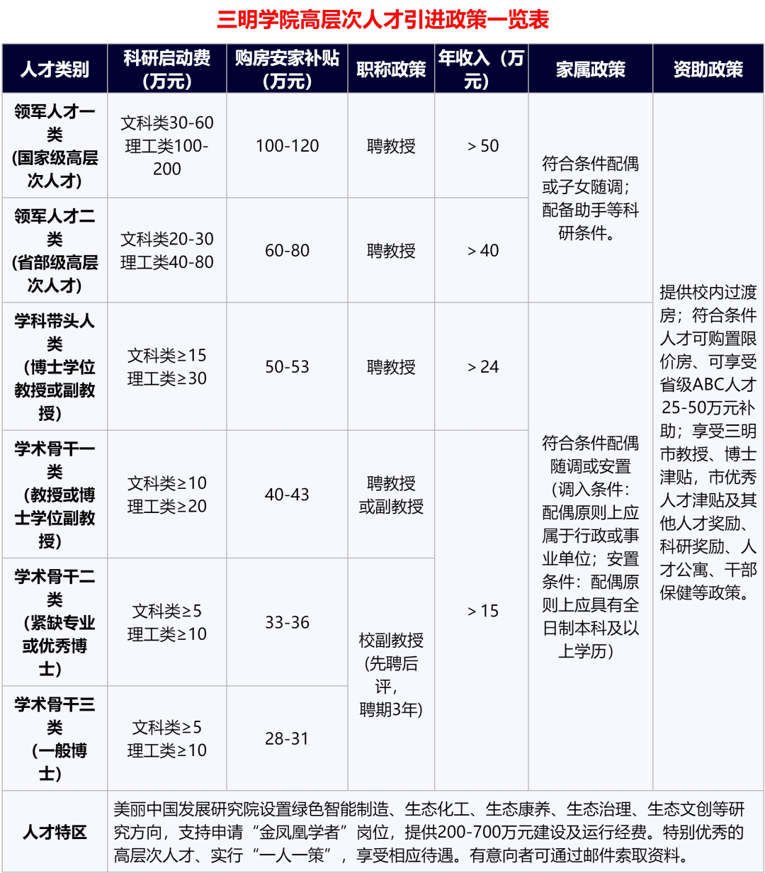 学校常年招聘博士、教授等高层次人才,填写《三明学院公开招聘工作人员报名登记表》,并将个人应聘简历、身份证、学历学位(中国大陆境外的学历学位须取得中国教育部留学服务中心认证)、专业技术职务任职资格证书、学术成果等材料扫描件压缩后,以“XX学科博士XX(姓名)应聘”为主题,发邮件到我校招聘邮箱edurscjob@126.com、smxyrsc@163.com。