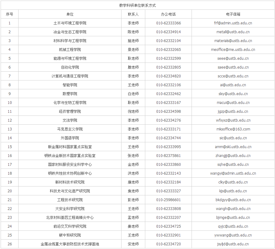 北京科技大学的历史渊源可追溯至1895年北洋西学学堂创办的中国近代史上第一个矿冶学科。1952年,学校由天津大学(原北洋大学)、清华大学等6所国内著名大学的矿冶系科组建而成,名为北京钢铁工业学院,是新中国建立的第一所钢铁工业高等学府。1960年,更名为北京钢铁学院,并被批准为全国重点高等学校。1984年,成为全国首批正式成立研究生院的高等学校之一。1988年,更名为北京科技大学。1997年5月,学校首批进入国家“211工程”建设高校行列。2006年,学校成为首批“985工程”优势学科创新平台建设高校。2014年,学校牵头的,以北京科技大学、东北大学为核心高校的“钢铁共性技术协同创新中心”成功入选国家“2011计划”。2017年,学校入选国家“双一流”建设高校。2018年,学校获批国防科工局、教育部共建高校。目前,学校已发展成为一所以工为主,工、理、管、文、经、法等多学科协调发展的教育部直属全国重点大学。 学校本部位于高校云集的北京市海淀区学院路,全校占地约80.39万平方米,校舍建筑总面积95.01万平方米。学校现有1个国家科学中心,1个“2011计划”协同创新中心,2个国家重点实验室,3个国家工程(技术)研究中心,2个国家科技基础条件平台,1个国家科技资源共享服务平台,2个国家级国际科技合作基地,1个国家安全监管监察科技支撑工程,66个省、部级重点实验室、工程研究中心、国际合作基地、创新引智基地等。 学校现有20个一级学科博士学位授权点,30个一级学科硕士学位授权点,86个二级学科博士学位授权点,144个二级学科硕士学位授权点,4个博士专业学位授权点,16个硕士专业学位授权点,17个博士后科研流动站,56个本科专业。学校冶金工程、材料科学与工程、矿业工程、科学技术史4个全国一级重点学科学术水平蜚声中外(2017年进入国家世界一流学科建设行列;在第四轮学科评估中,冶金工程、科学技术史获评A+,材料科学与工程获评A),安全科学与工程、环境科学与工程、控制科学与工程、动力工程与工程热物理、机械工程、计算机科学与技术、土木工程、化学、外国语言文学、管理科学与工程、工商管理、马克思主义理论等一批学科具有雄厚实力,力学、物理学、数学、信息与通信工程、仪器科学与技术、纳米材料与器件物理学、光电信息材料与器件等基础学科与交叉学科焕发出勃勃生机。2019年,安全科学与工程、人工智能科学与工程入选北京高校高精尖学科建设行列。 学校拥有一支治学严谨的师资队伍。教职工总数3309人,具有正高级专业技术职务的教职工740人,具有副高级专业技术职务的教职工783人,其中专任教师2171人,在站博士后314人。现有中国科学院院士4人(双聘1人),中国工程院院士12人(双聘7人),国务院学位委员会学科评议组成员4人,国家973项目首席科学家3人,国家级有突出贡献专家13人,省部级有突出贡献专家10人,国家杰出青年科学基金获得者27人,“万人计划”领军人才25人、青年拔尖人才25人,国家级教学名师2人,国家百千万人才工程人选19人,国家优秀青年科学基金获得者24人,北京市教学名师40人,教育部跨世纪人才/青年教师奖/新世纪优秀人才103人。 2.北京科技大学人事处人事科 王老师 联系电话:+86-10-62332009 3.北京科技大学人事处博士后工作办公室 张老师一、学校简介