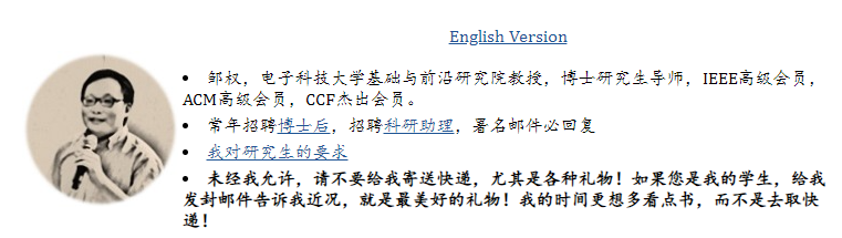 如果有意愿读博,请直接告诉我,我会优先考虑! 我的研究方向是大规模数据挖掘方法、字符串处理算法与生物信息学问题(不理解的话不妨看看这四个题目),请先认真思考对这个方向感不感兴趣!每年各种面试之前都有同学来联系我,起誓发愿非说喜欢我,希望面试的时候能够给他高分,录用通知拿到后立刻跟我说不喜欢这个研究方向等等。我想对这些有点“小智慧”的同学说,人品是一个人最大的财富。你今后开题、毕业答辩、评奖学金的时候很有可能还会碰见我,鉴于对您人品的不信任,我很有可能对您的学术成果刨根问底。 我希望我的学生喜欢挑战未知问题,并以发表学术论文为乐趣;我对研究生要求较高,我要求研究生毕业之前必须写出高水平学术论文(英文)。 我不允许我的学生参与学生会、社团、学生干部等活动(如果您热衷当干部,不用往下看了,不代表您不优秀,是我不适合给您当导师),不允许我的学生忙于做家教、助教等工作(我会提供超过家教、助教收入的补助,真心恳请您珍惜自己的时间),不希望我的学生把大部分精力放在谈恋爱上; 我鼓励我的学生以科研作为一生追求的目标,鼓励我的学生在毕业后出国读博、去IT公司从事技术研发或以技术为核心创业,并会尽我全力帮助;(以混个学位为目标的同学不用往下看了,不代表您不优秀,而是您不适合我的研究团队) 目前我的科研经费充足,我会资助我的学生开学术会议,甚至出国开会;我会给我的学生发补助,但我做的都是研究性而非工程性课题,所以补助可能不会超过500元/月,除非你的表现非常出色或家庭经济有困难; 我希望我的学生有能力读大量的英文论文,掌握简单的JAVA编程和Linux操作命令,当然这不是必须的,只要你喜欢学习新东西并有基本的编程能力就可以; 选择我作为导师,意味着暑假中大部分时间要留在学校完成科研任务,当然我会发高于平常的补助; 我允许表现优秀的学生在研二研三到国外知名高校、研究机构做RA或访问学生,我会积极推荐,但前提是你要足够优秀。 我每年招生名额是2名(学术型硕士,随当年学院招生情况名额会略有调整),有时也会与同事合作指导,希望您能尽量提前联系。 建议单独直接联系我;请不要“组团”来联系我,因为名额有限,通常我很难一次性答应多个同学; 如果您自认为符合上述要求,请点击这里。一般情况下我都会尽快给予答复,在此期间或之前请不要答应(最好不要联系)其他导师,以免造成我或我的同事浪费掉招生名额。现在同时联系多个导师、答应后又随意换导师的学生太多了,我希望我的学生以诚信为第一。 与我联系的最佳方式是Email(zouquan(a)nclab.net),任何疑问都欢迎邮件咨询,不过邮件请署名,通常我会在半小时内回复(上课、出差时可能会耽搁一些时间,但不会超过1天)。 如果我同意招收你后,请保持每周给我一份邮件,简单汇报工作情况;对于长时间和我没有保持联系的学生,我很可能忘记你了并且没有给你留招生指标。 最后,我想说的是:读研应该不是一个找工作的跳板,而是一个提升自我的过程。我指导的研究生学会的不仅是weka,java和hadoop,还应该有沉稳的性格、面对困难的勇气和战胜一切对手的信心。我希望我的研究生应该习惯不把今天的事情拖到明天,习惯一个人在深夜顶风冒雨走回寝室,喜欢一个人去旅行,不是一个没有异性就苦闷烦躁的人。