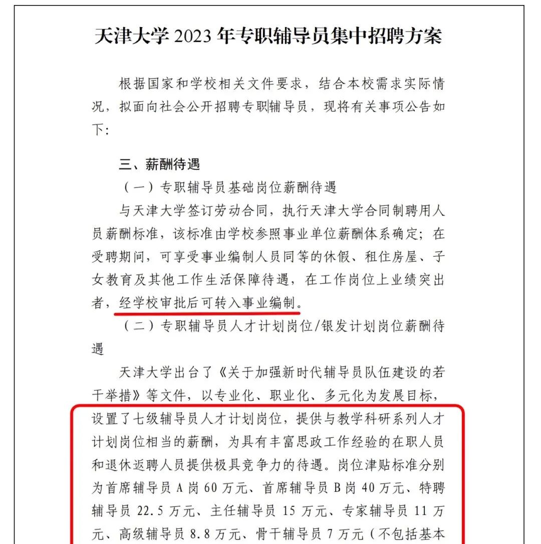 近日,天津大学宣布将辅导员的工资待遇大幅提高,薪酬对标教学、科研类人才,参照事业编制教师发放工资,并提供各种福利,包括带薪休假、子女教育等。