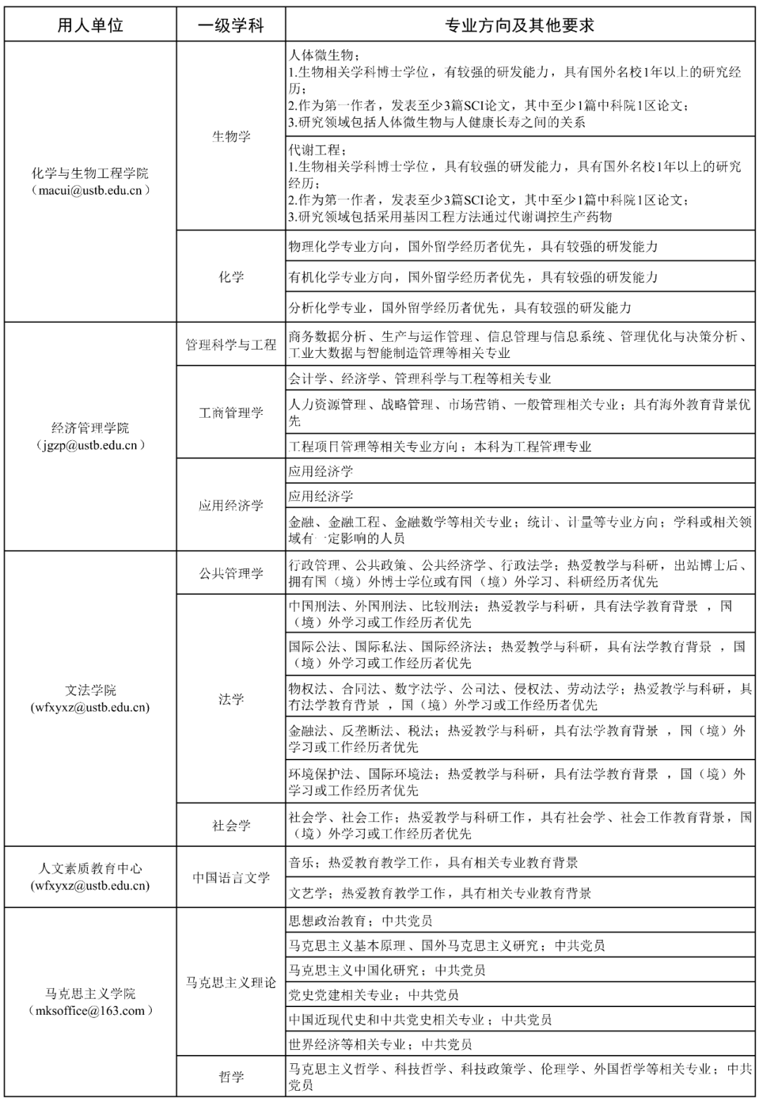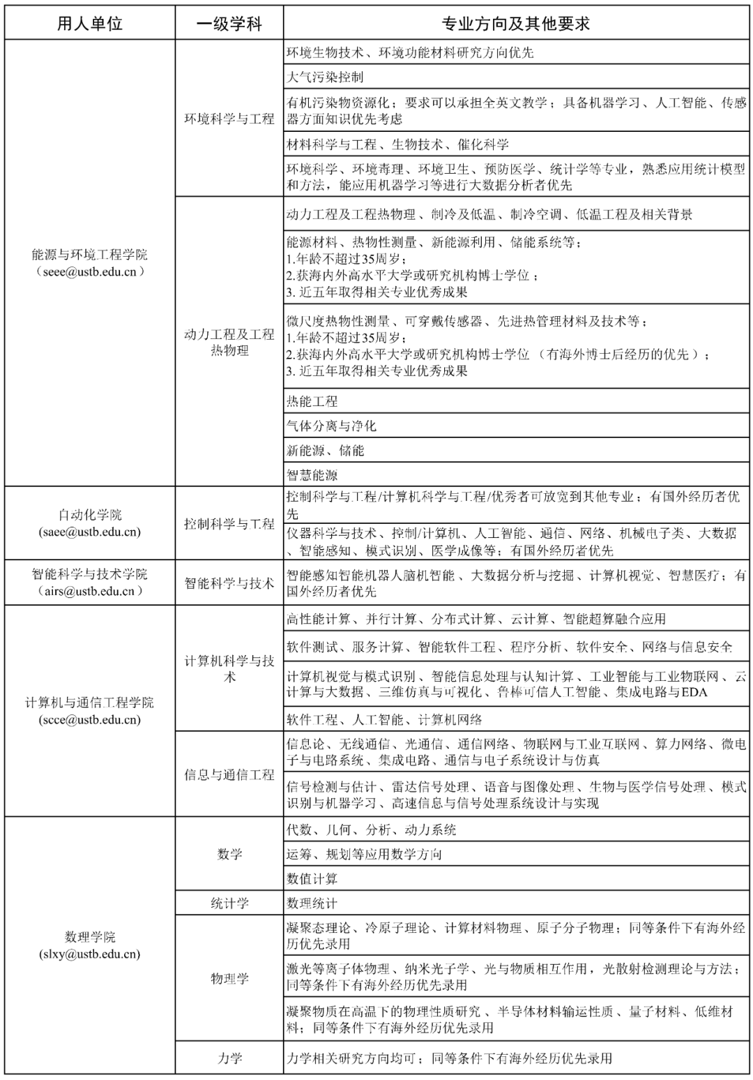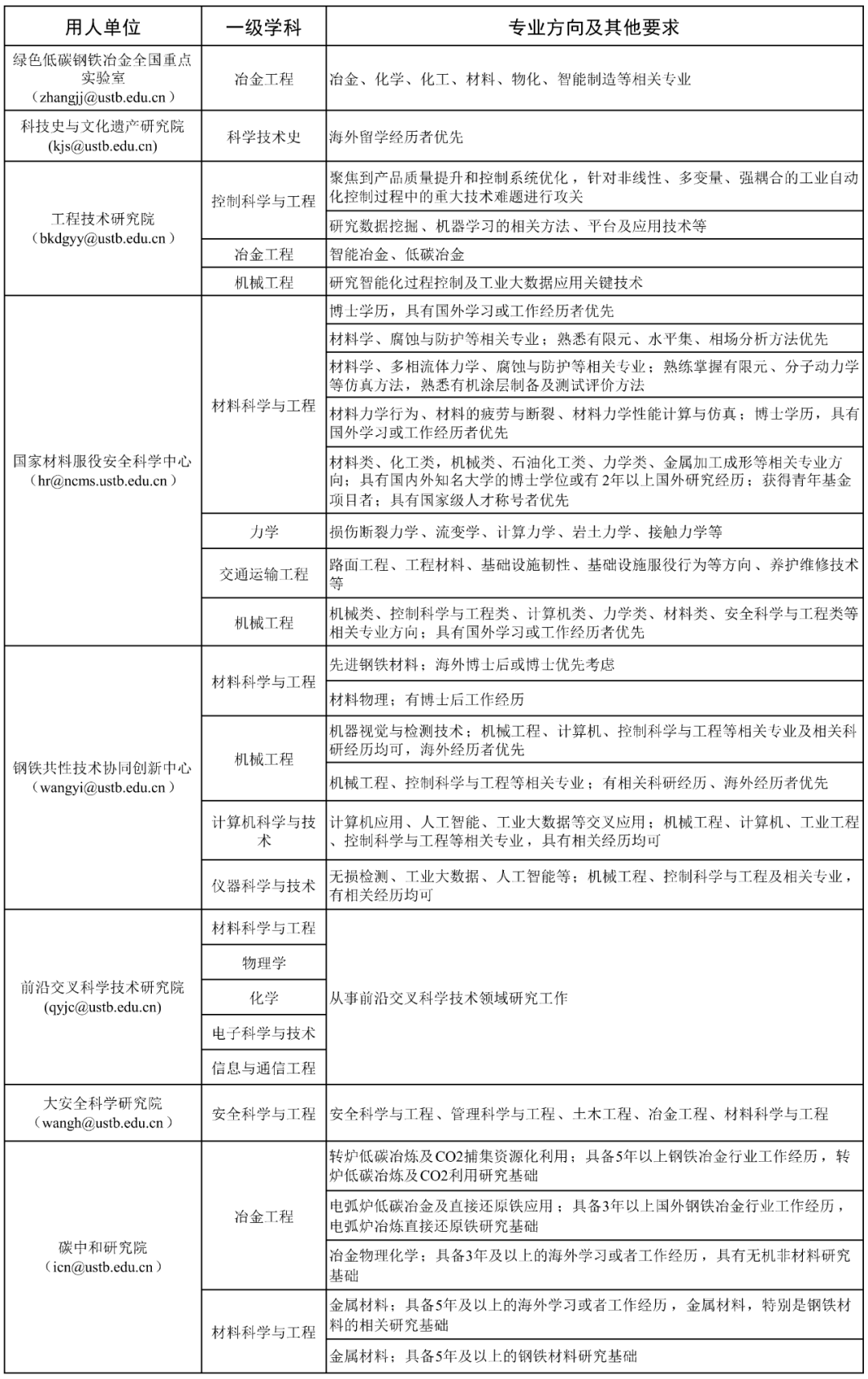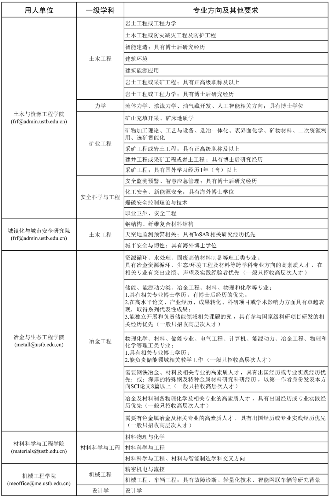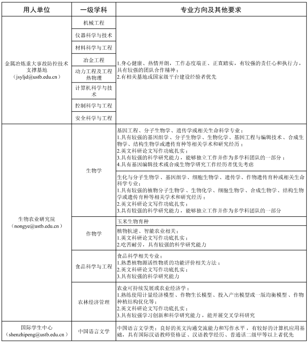 03 招聘程序 1.应聘人员网上投递简历。即日起,接收简历投递。接收邮箱为《需求情况表》中各单位公布的专用电子邮箱。应聘人员同步登录http://rczp.ustb.edu.cn注册并申请相应岗位。 2.各用人单位根据岗位需求及应聘者情况,进行筛选。 3.各用人单位按程序组织面试、试讲、综合考察等相关环节。 4.人事处按照学校相关规定和程序,确定接收人选。 04 其他 1.拟聘人员如无博士后工作经历,原则上须在学校设立的博士后科研流动站进行研究工作。 2.对于符合教育部留学服务中心在京就业落户要求的海外院校留学归国人员,并选择不再入站从事博士后研究工作的,学校可协助为其办理在京落户事宜,并于正式落户后按照事业编制人员管理。