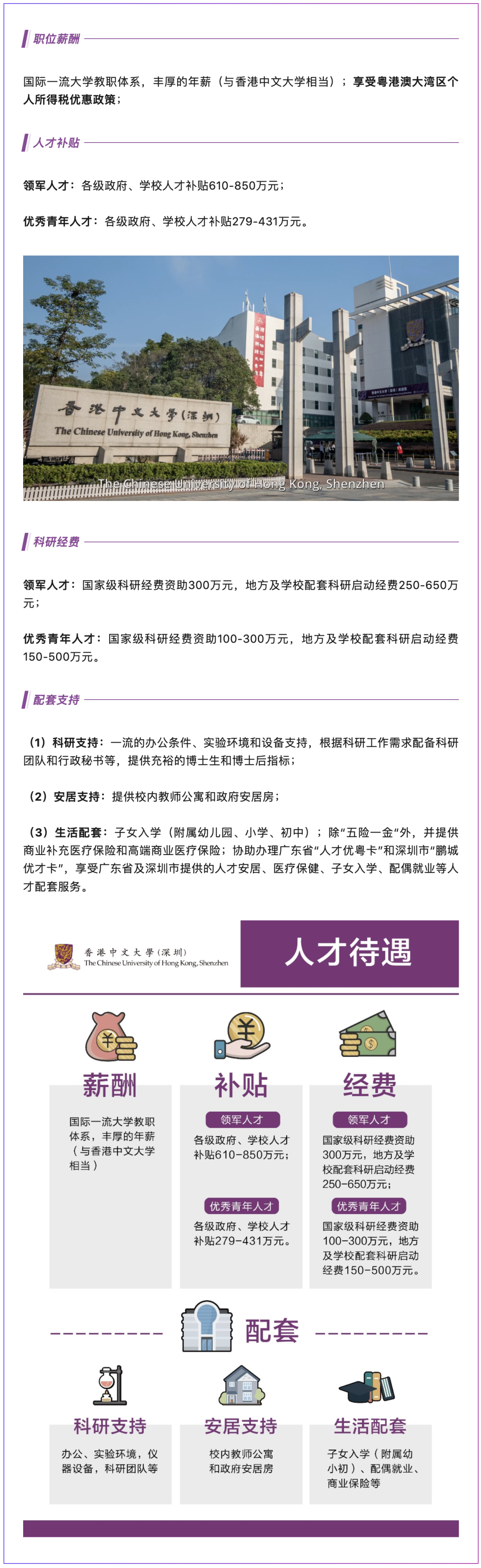 competitive salary (equivalent to that of The Chinese University of Hong Kong) ; preferential tax policy for overseas talent working in the Guangdong-Hong Kong-Macao Greater Bay Area;