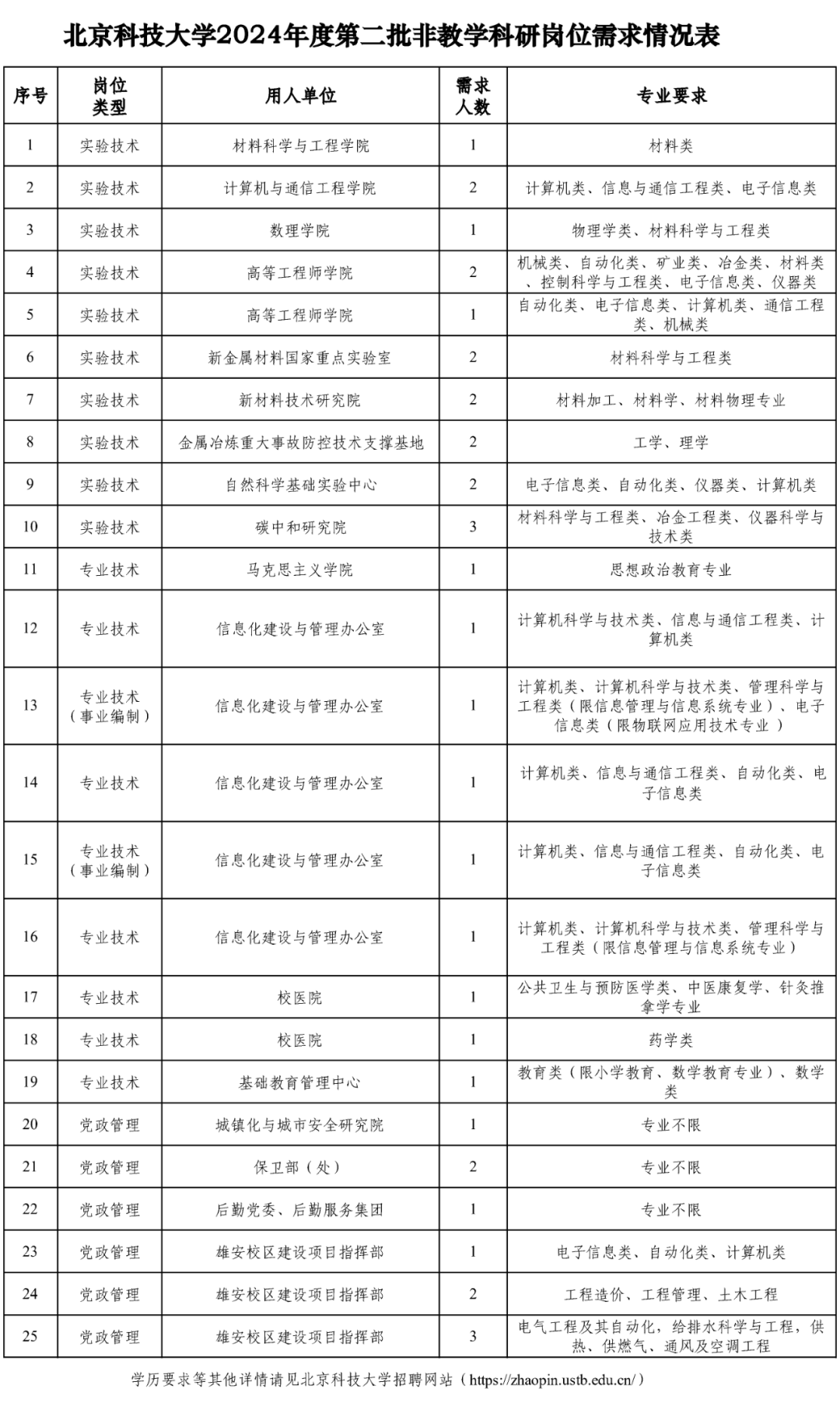 具体详见《北京科技大学2024年度第二批非教学科研岗位需求情况表》。