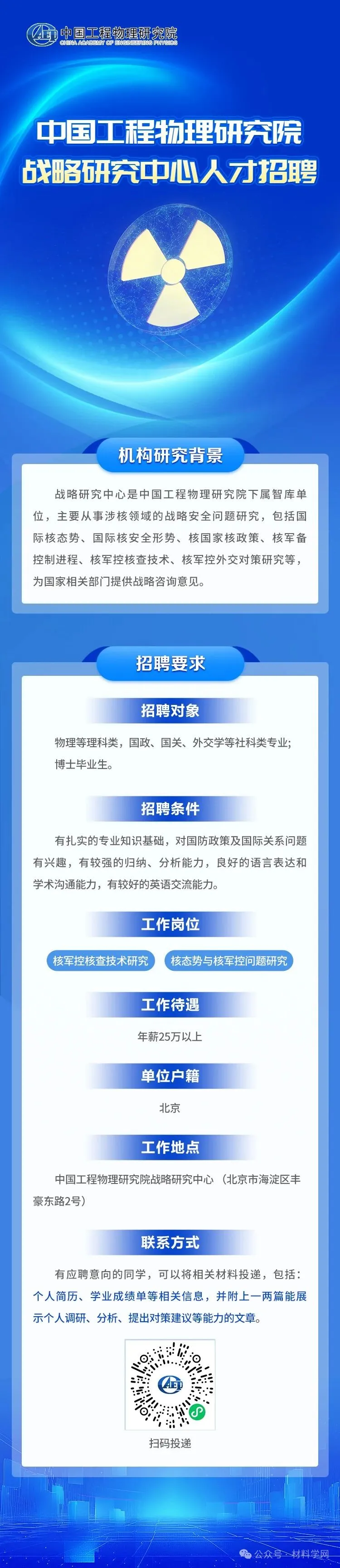 【招聘】年薪25万+:中国工程物理研究院战略研究中心招聘材料毕业生!