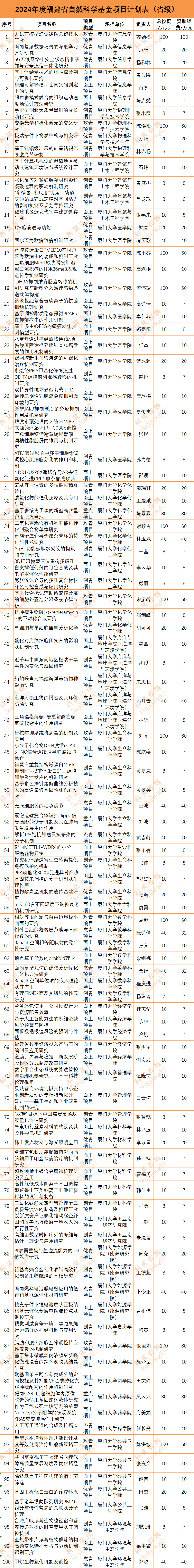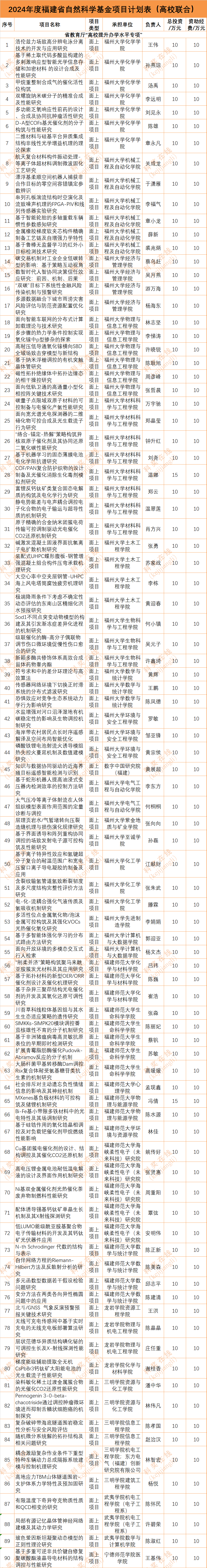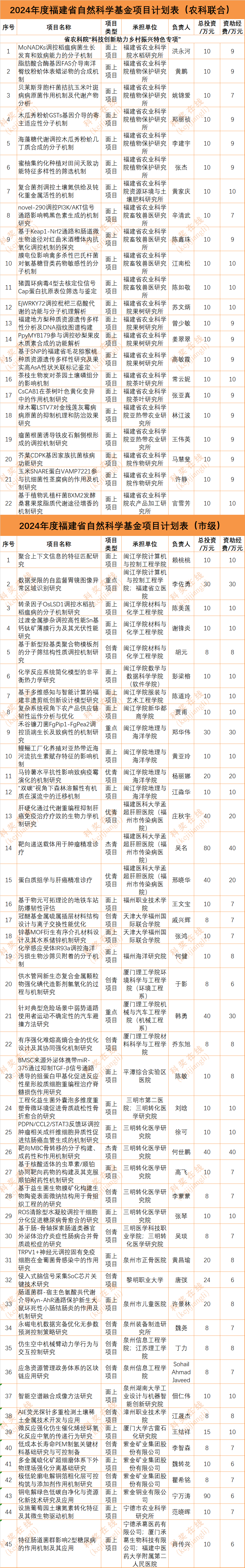 今日,福建省公布了2024年度省自然科学基金科技项目计划和经费资助名单,其中省级581项、市级45项。其中攻青项目16项、杰青项目45项、优青项目60项,其他面上、创青项目等505项。具体如下: