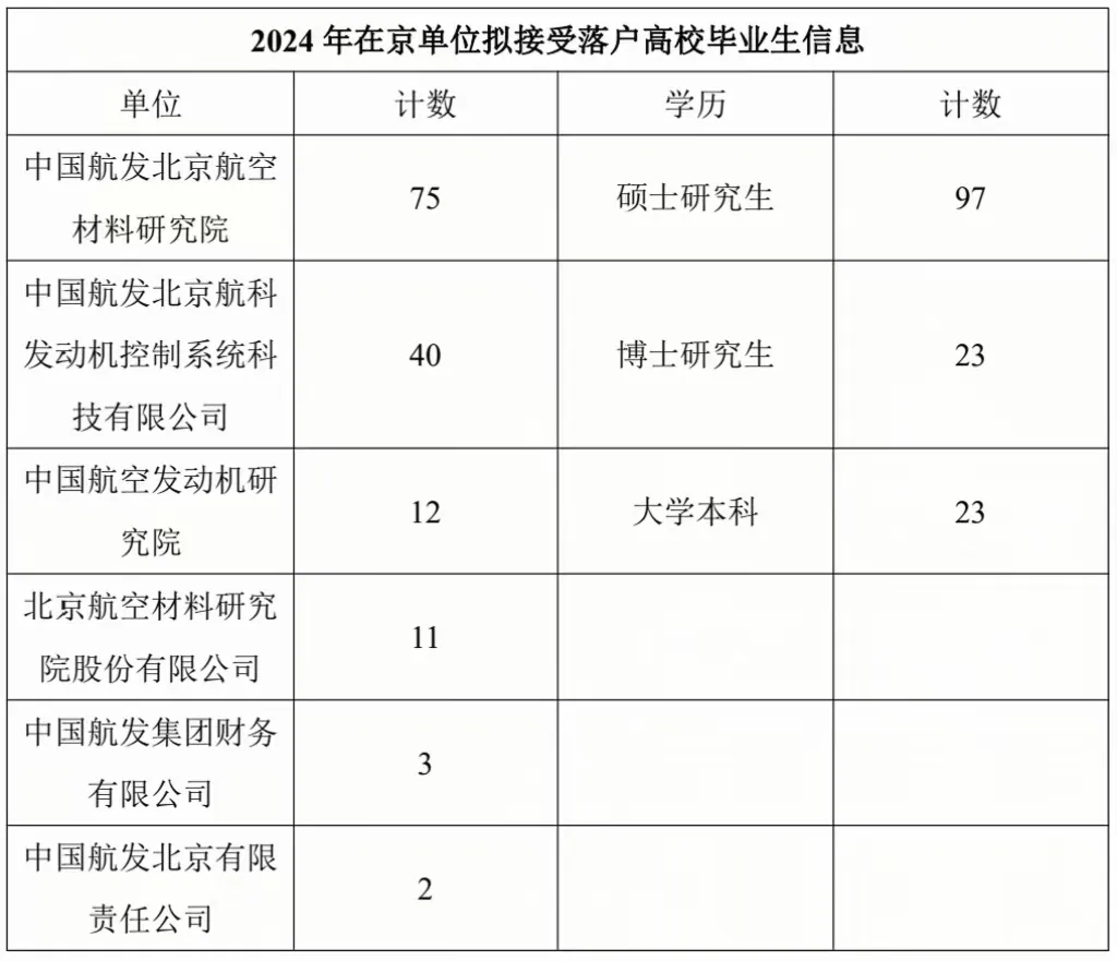 下表为中国航发在京单位公布的拟接受落户高校毕业生信息,在6家单位中,中国航发北京航空材料研究院75人,发动机研究院12人。