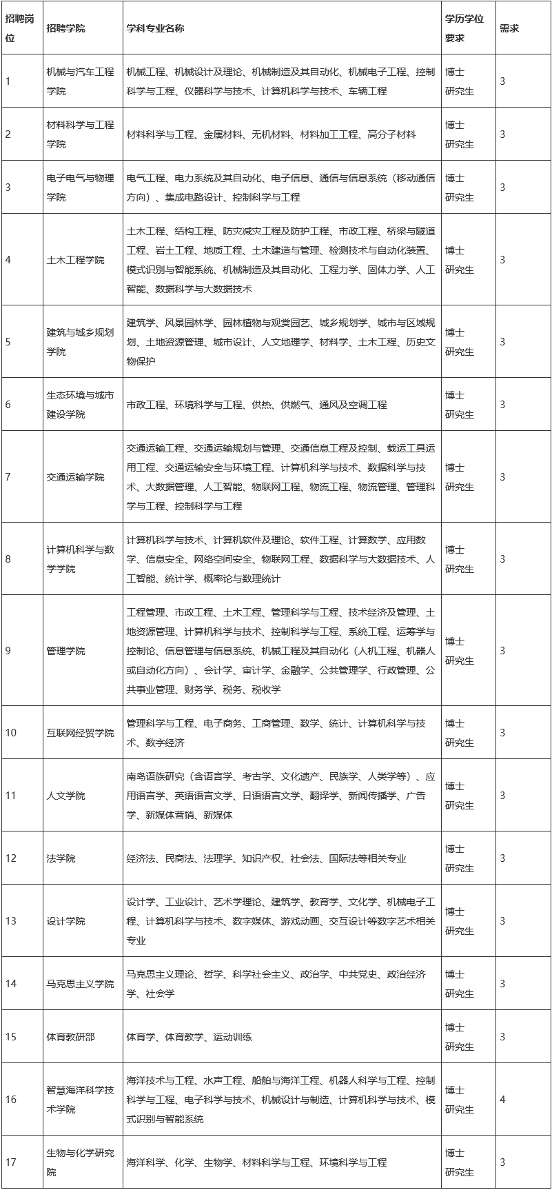 一、福建理工大学2024年招聘52名高层次人才方案 HOT! 福建理工大学是省属公办全日制普通高等学校,是福建省示范性应用型本科院校、福建省博士学位授予培育单位、福建省一流学科建设高校、福建省一流应用型建设高校(A类),具有120多年办学历史。学校秉承“真、诚、勤、勇”校训精神,弘扬“大机电、大土木”传统优势,面向“大海洋”新兴领域,发展成为以工为主,理工融合,多学科协调发展的应用型大学。学校现有旗山、鼓山等校区,设有17个学院(部),71个本科专业、6个硕士学位授权一级学科、9个硕士专业学位授权点,涵盖13个硕士专业学位领域,全日制在校生共21096人。学校正进入全面建设高水平创新型理工大学新阶段,聚力人才强校,在提升办学层次和办学水平上取得更大突破,在服务和融入新福建建设上展现更大作为,奋力开创学校高质量发展新局面。现因工作需要,拟在人员控制总量内面向社会招聘高层次人才52名,具体方案如下: 一、基本条件 1.具有中华人民共和国国籍,拥护中国共产党的领导,热爱社会主义,遵纪守法,品行端正。 2.身心健康,符合我省现行教师资格申请人员体检标准。 3.取得境外学历学位证书报名者应提供教育部留学服务中心出具的学历学位认证书。认证书等各项资格认定截止时间为2024年12月31日。 4.年龄原则上不超过40周岁,具有副高级职称的不超过45周岁,具有正高级职称的不超过50周岁。特别优秀或紧缺人才,年龄可适当放宽。 二、招聘岗位及要求 三、引进待遇单位:万元 四、信息发布本招聘方案在福建省人力资源和社会保障厅网站、福建就业网和福建理工大学人才招聘网站公开发布。 五、报名和资格审核 1.报名时间:即日起至2024年12月31日,岗位成功招聘截止。 2.报名方式: (1)凡符合条件者均可报名。采用电子邮件的方式进行,报名阶段不接收纸质材料。应聘者应填写《福建理工大学引进人才应聘表》,在应聘表中填写的相关信息需要提供相对应的佐证材料,以扫描件压缩包形式发送至福建理工大学教师工作部·人事处邮箱(rsc@fjut.edu.cn)以视报名。邮件标题及附件名称以“姓名+应聘学院+应聘需求学科专业”方式命名。(同时将简历抄送至1584504047@qq.com 邮件标题:募格科聘-应聘岗位-姓名) (2)相关佐证材料包括:身份证、学历学位证书(本科阶段以来的学历学位)、职称证书、近五年学术论文及检索证明、科研项目、重要获奖情况等。资格审核贯穿招聘工作全过程,应聘人员应严格按照招聘岗位的条件要求报名,并对提交材料的真实性负责。在任何环节发现应聘人员不符合招聘条件或弄虚作假的,一经核实,即取消资格,问题严重的追究相关责任。应聘材料恕不退还,请自行保留备份。 六、考核根据《事业单位公开招聘人员暂行规定》(闽人发[2006]10号)有关规定,采取直接考核的方式进行公开招聘。 七、体检体检标准及项目参照我省现行教师资格申请人员体检标准执行,未按时体检的,视为自动放弃。 八、公示考核、体检合格,且符合岗位各项条件要求的拟聘人员在福建省人力资源和社会保障厅网站、福建就业网和福建理工大学人才招聘网站公示。 九、聘用公示结果不影响聘用的,办理聘用核准手续,单位与拟聘人员签订聘用合同。 十、联系方式联系地址:福建省福州市闽侯县上街镇学府南路69号福建理工大学教师工作部·人事处。 邮政编码:350118 联系人:张老师 联系电话:0591-22863042 传真:0591-22863047 学校网址:www.fjut.edu.cnE-mail: 附件下载:福建理工大学引进人才应聘表.doc 二、西湖大学西湖基因编辑中心 HOT! 西湖基因编辑中心致力于基因编辑领域关键基础科学问题的前沿研究,以及应用领域的瓶颈应用技术的开发。研究方向包括:开发设计新型基因编辑以及递送工具,在植物、动物等细胞和体内的基因编辑应用研究,以及基因编辑相关DNA损伤修复。 招聘岗位 岗位一:西湖大学免疫与基因编辑实验室博士后(3名) 岗位职责: 1、在PI指导下独立承担和开展课题研究; 2、指导实验室其他成员开展科研工作; 3、统筹实验室整体管理。 任职要求: 1、年龄不超过35周岁;已取得或即将取得博士学位; 2、具有适应性免疫(免疫疾病或病毒感染动物模型)、噬菌体生物学、在体基因编辑、CRISPR筛选、计算生物学(单细胞数据分析、深度学习、虚拟筛选)、单分子力学或结构生物学(冷冻电镜、大分子晶体学)研究背景的博士学位或研究经历; 3、认真负责、积极主动、诚实守信、善于沟通,有团队合作精神。 岗位二:西湖大学免疫与基因编辑实验室科研助理(3名) 岗位职责: 1、参与实验室课题研究; 2、负责实验室试剂、耗材采购、监督管理; 3、负责实验室细胞培养、单细胞制样、蛋白表达纯化、小鼠的管理; 4、为实验室提供其他相关支持。 任职要求: 1、年龄不限,能够长期稳定工作; 2、具有生物医学及相关专业硕士及以上学历,具有免疫学、病毒学、噬菌体生物学或结构生物学等方向的研究背景; 3、具有较强的实验动手能力; 4、能够阅读理解英文专业文献,掌握基本的免疫学、细胞生物学、生物化学或小鼠遗传学学实验技能; 5、对科研事业有热情,工作主动、善于沟通且具有高度责任心和团队精神。 岗位三:西湖大学免疫与基因编辑实验室助理研究员/副研究员/研究员(2名) 岗位职责: 1、在实验室负责人指导下独立承担和开展课题研