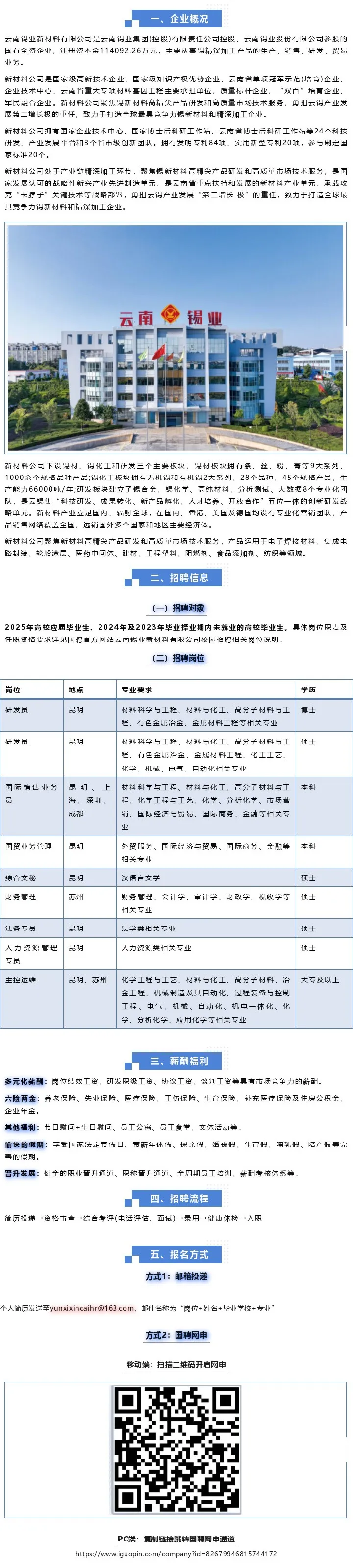 今日招聘单位: 一、西安稀有金属材料研究院有限公司招聘简章 HOT! 一、稀有院简介: 西安稀有金属材料研究院有限公司(以下简称“稀有院”)于2017年12月21日注册成立。稀有院是“国家先进稀有金属材料技术创新中心”运营主体单位,拥有“陕西省稀有金属材料创新中心”及“陕西省先进稀有金属材料共性技术研发平台”双省级创新平台,是一个全新模式、全新体制的高层次、高水平科技创新平台。稀有院由西北有色金属研究院发起,包括西安交通大学、西北工业大学、东北大学等高校共同合作建设。西北有色金属研究院名誉院长周廉院士出任首任院长,多名院士、长江学者和科技界杰出青年学者共同组成专家团队。稀有院研究生学历员工超过97.9%,其中博士研究生为66.4%。 稀有院为响应“建设世界科技强国,打造一批科研院所,培育一批创新型领军企业”等国家创新体系建设要求,组建了核用材料、新能源材料、稀有金属功能材料、电容器材料及传感器、粉体材料及制品、金属基复合材料、高熵合金及非晶材料、表面技术及涂层材料等团队,重点为我国核工程、航空航天及海洋工程研发急需高端关键材料,为解决国家战略领域和产业发展关键瓶颈问题提供支撑。 稀有院重点建设稀有金属材料研发、中试验证、公共测试和成果转化平台,以及人才培养与国际交流合作基地。稀有院已取得ISO9001:2015质量管理体系认证、中核集团合格供应商认证,是国家高新技术企业,获批建立了国家博士后科研工作站、陕西省和西安市博士后创新基地、西安市院士工作站等人才创新平台,通过了陕西省新型研发机构、国家知识产权优势企业、陕西省瞪羚企业、西安市瞪羚企业、西安市核用稀有金属材料工程技术研究中心、西安市核用先进稀有金属材料制备工程研究中心、西安市企业技术中心、秦创原两链融合“促进器”示范平台等认定。 二、需求岗位: 1、岗位名称:研发工程师 2、聘任要求: 1)专业要求:材料学、材料加工、材料物理化学、复合材料、粉末冶金、核用材料、氢能源、锂电池等专业; 2)研究方向与需求人数: 3)学历要求:博士研究生(或优秀硕士研究生符合岗位要求者); 4)其他要求:第一作者发表SCI论文总影响因子IF不低于6。 3、福利待遇: 1)年收入:博士:28-31万/年;硕士:16—19万/年; 2)结合业绩发放年终奖、科研奖、专利奖、项目奖等; 3)为员工缴纳七险二金; 4)享有节日福利、住房补助、交通补助、用餐补助、采暖补贴、高温补贴、企业专项医疗补助、年休假、职工年度体检等福利; 5)博士安家费: 税后35万; 6)相关股权激励。 4.职业发展: 1)为研发技术人员提供不低于40万的科研启动经费; 2)提供完善的职业发展体系(从助理研究员至首席研究员的发展通道)。 三、其他 应聘者请将个人简历(命名方式:募格科聘-硕/博士-毕业院校-专业-姓名),发送至邮箱:hr@rmmi.cn,联系人:李女士,联系电话:029-86231074。 二、云南锡业新材料有限公司 注:同时将简历抄送至1584504047@qq.com 邮件标题:募格科聘-应聘岗位-姓名 三、迪文科技2025届校招正式启动 注:同时将简历抄送至1584504047@qq.com 邮件标题:募格科聘-应聘岗位-姓名