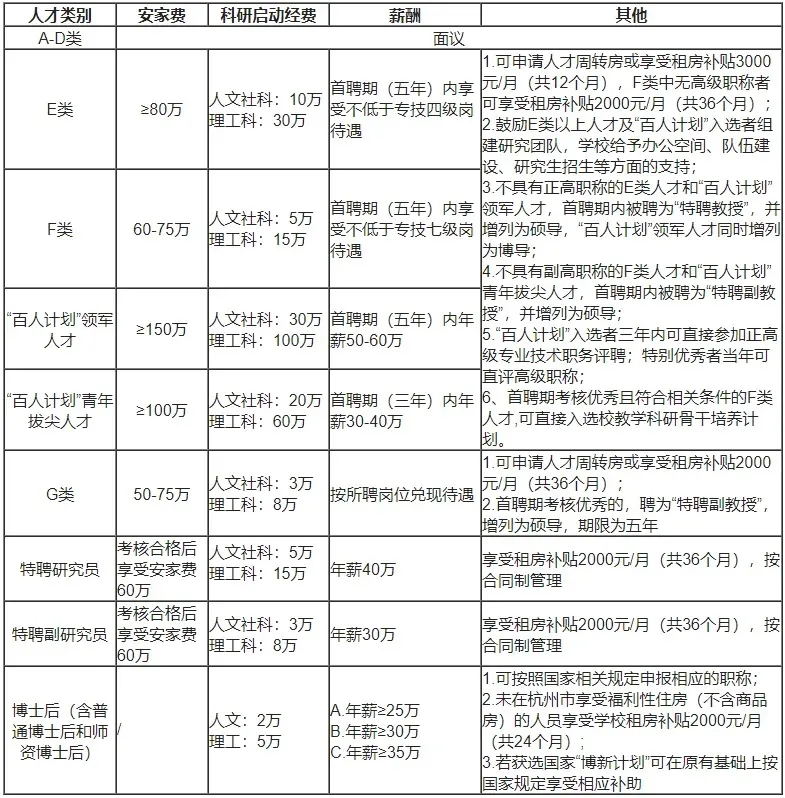 1 单位简介 浙江理工大学坐落在历史文化名城——浙江省杭州市,是一所以工为主,特色鲜明,优势突出,理、工、文、经、管、法、艺术、教育等多学科协调发展的省重点建设高校。学校前身——蚕学馆,是杭州知府林启为实现实业救国、教育救国的宏愿于1897年创办的,是我国最早创办的新学教育机构之一。 学校进入“三校区一中心”的发展新格局,下设19个学院(教研部),举办1所独立学院,现有全日制在校学生37700余人,其中研究生8300余人。学校师资力量雄厚,现有教职工2600余人,其中正高职称350余人,副高职称720余人。拥有中国工程院院士等一大批国家级和省部级高层次人才。 学校现有本科招生专业58个,其中“双万计划”国家级一流本科专业建设点专业28个,国家(教育部)特色专业8个,拥有一级学科博士学位授权点6个、一级学科硕士学位授权点24个,有纺织科学与工程、机械工程、材料科学与工程、生物学4个一级学科博士后科研流动站;化学、材料科学、工程学进入ESI全球排名前3‰;植物学与动物学进入ESI全球排名前1%。现有国家地方联合工程研究中心、教育部重点实验室(工程研究中心)、国家级国际科技合作基地等一批国家和省部级科研、教学平台。学校在众多领域完成了一系列国家科技计划项目和国家、省部基金科研项目,获得国家技术发明二等奖8项、国家科技进步二等奖8项,鲁迅文学奖1项、何梁何利基金科学与技术创新奖2项等。 有着127年办学历史的浙江理工大学,诚邀海内外英才加盟。 2 招聘基本条件 1.热爱社会主义祖国,拥护中华人民共和国宪法,拥护中国共产党,遵纪守法,品行端正,具有良好的师德师风和职业道德;热爱教育事业,爱岗敬业,具有较强的团队合作精神和奉献精神。 2.身体健康,体检合格,具备适应岗位要求的身体条件和心理条件。 3.基础理论和专业知识扎实,具备胜任所聘岗位所需的专业或技能条件,能正常履行岗位职责。 4.正高职称者年龄原则上要求在45周岁以下,副高职称在40周岁以下,博士在35周岁以下。业绩特别优秀者可适当放宽。 3 招聘人才类别及要求 学校常年面向海内外诚聘各类型及相当学术水平的人才,根据拟引进人员的教学科研水平,引进人才分为A-G七个层次、“百人计划”高层次人才、特聘研究员和特聘副研究员岗。 (一)A-G类人才 1.A类(卓越教授):拥有良好的学术声誉和学术领导能力,学术研究处于世界前沿,在国内外享有广泛的学术声望和影响力,能引领本学科突破性发展,是国内外本学科公认的学术大师、著名专家学者等。 2.B类(杰出教授):具有深厚的学术造诣,在所研究领域已取得国内外同行公认的标志性研究成果,具有带领本学科在其前沿领域保持或赶超国际领先水平以及带领团队协同攻关的能力,达到或接近国家级领军人才相应学术水平的学者。 3.C类(精英教授):在本学科领域具有良好的学术影响力,已取得具有重要学术影响的标志性研究成果,为所在学科领域的知名学者或学科带头人,达到或接近国家级青年人才相应学术水平的学者。 4.D类(精英教授):具备较高创新能力,研发水平和成果为同行公认,达到国际领先水平,达到或接近省级人才计划相应学术水平的学者。原则上年龄不超过45周岁(特别优秀人才年龄可适当放宽)。 5.E类(特聘教授):具有正高职称,年龄不超过45周岁,且近三年有重要学术成果,在其研究领域有重要影响力的人才;或具有副高职称,年龄不超过40周岁,且近三年业绩特别突出或属于学校急需紧缺专业。 6.F类(特聘副教授):具有副高职称,年龄不超过40周岁,且近三年内有重要学术成果,在其研究领域有一定影响力的人才;或年龄不超过35周岁,业绩特别突出的博士、博士后。 7.G类(优秀博士):具有博士学位,年龄不超过35周岁,科研业绩优秀,具有良好的培养潜质。 (二)“百人计划”高层次人才: 1.“百人计划”领军人才:具有博士学位,年龄原则上不超过45周岁(非华裔外籍人士年龄不超过55周岁),具有国家级领军人才潜质的海内外学者。 2.“百人计划”青年拔尖人才:具有博士学位,年龄不超过35周岁,具有国家级青年人才潜质的海内外学者。 (三)特聘研究员和特聘副研究员岗(年薪制) 1.具有博士学位,年龄不超过35周岁,科研业绩优秀,具有良好的培养潜质; 2.引进范围:我校博士点学科和一流学科A类学科。 (四)博士后(含普通博士后和师资博士后) 1.具有博士学位(获得博士学位一般不超过3年),品学兼优、身体健康; 2.年龄在35周岁以下; 3.能够在我校流动站全职从事研究工作的时间不少于两年; 培养期满,通过考核并获得全国博士后管理委员会颁发《博士后证书》者,可申请作为浙江理工大学教师引进,同等条件下优先考虑录用。 全职博士后人员招聘人数不限。 4 招聘学科 数学、物理学、光学工程、化学、材料科学与工程、高分子化学与物理、心理学、纺织科学与工程、化学工程与技术、设计学、计算机科学与技术、机械工程、新闻传播学、戏剧与影视、艺术学、软件工程、动力工程及工程热物理、网络空间安全、信息与通信工程、控制科学与工程、仪器科学与技术、土木工程、管理科学与工程、建筑学、风景园林、生物学、药学、应用经济学、统计学、理论经济学、工商管理学、审计、社会学、公共管理学、法学、政治学、中国语言文学、英语语言文学、马克思主义理论、中共党