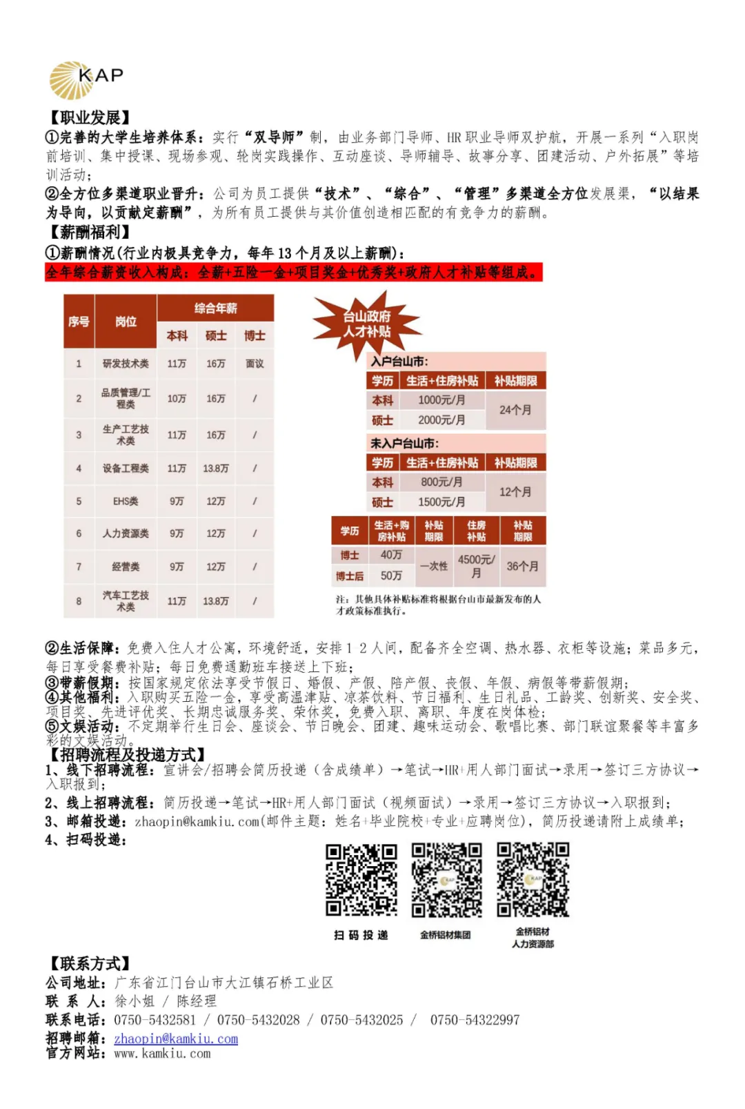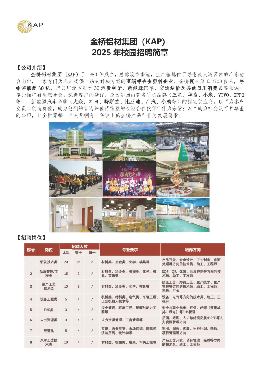 今日招聘单位: 一、西安稀有金属材料研究院有限公司招聘简章 HOT! 一、稀有院简介: 西安稀有金属材料研究院有限公司(以下简称“稀有院”)于2017年12月21日注册成立。稀有院是“国家先进稀有金属材料技术创新中心”运营主体单位,拥有“陕西省稀有金属材料创新中心”及“陕西省先进稀有金属材料共性技术研发平台”双省级创新平台,是一个全新模式、全新体制的高层次、高水平科技创新平台。稀有院由西北有色金属研究院发起,包括西安交通大学、西北工业大学、东北大学等高校共同合作建设。西北有色金属研究院名誉院长周廉院士出任首任院长,多名院士、长江学者和科技界杰出青年学者共同组成专家团队。稀有院研究生学历员工超过97.9%,其中博士研究生为66.4%。 稀有院为响应“建设世界科技强国,打造一批科研院所,培育一批创新型领军企业”等国家创新体系建设要求,组建了核用材料、新能源材料、稀有金属功能材料、电容器材料及传感器、粉体材料及制品、金属基复合材料、高熵合金及非晶材料、表面技术及涂层材料等团队,重点为我国核工程、航空航天及海洋工程研发急需高端关键材料,为解决国家战略领域和产业发展关键瓶颈问题提供支撑。 稀有院重点建设稀有金属材料研发、中试验证、公共测试和成果转化平台,以及人才培养与国际交流合作基地。稀有院已取得ISO9001:2015质量管理体系认证、中核集团合格供应商认证,是国家高新技术企业,获批建立了国家博士后科研工作站、陕西省和西安市博士后创新基地、西安市院士工作站等人才创新平台,通过了陕西省新型研发机构、国家知识产权优势企业、陕西省瞪羚企业、西安市瞪羚企业、西安市核用稀有金属材料工程技术研究中心、西安市核用先进稀有金属材料制备工程研究中心、西安市企业技术中心、秦创原两链融合“促进器”示范平台等认定。 二、需求岗位: 1、岗位名称:研发工程师 2、聘任要求: 1)专业要求:材料学、材料加工、材料物理化学、复合材料、粉末冶金、核用材料、氢能源、锂电池等专业; 2)研究方向与需求人数: 3)学历要求:博士研究生(或优秀硕士研究生符合岗位要求者); 4)其他要求:第一作者发表SCI论文总影响因子IF不低于6。 3、福利待遇: 1)年收入:博士:28-31万/年;硕士:16—19万/年; 2)结合业绩发放年终奖、科研奖、专利奖、项目奖等; 3)为员工缴纳七险二金; 4)享有节日福利、住房补助、交通补助、用餐补助、采暖补贴、高温补贴、企业专项医疗补助、年休假、职工年度体检等福利; 5)博士安家费: 税后35万; 6)相关股权激励。 4.职业发展: 1)为研发技术人员提供不低于40万的科研启动经费; 2)提供完善的职业发展体系(从助理研究员至首席研究员的发展通道)。 三、其他 应聘者请将个人简历(命名方式:募格科聘-硕/博士-毕业院校-专业-姓名),发送至邮箱:hr@rmmi.cn,联系人:李女士,联系电话:029-86231074。 二、天津仁爱学院2024年教师招聘公告 一、专任教师招聘位 二、应聘条件 1、热爱高等教育事业,有良好的师德师风和较高的政治素质,遵纪守法,品行端正; 2、具有较强的组织协调能力、管理能力、文字能力和语言表达能力; 3、身体健康,能胜任应聘职务所需要的身体条件; 4、无违法犯罪,行政处分记录。 三、招聘程序 1、应聘人员提交个人简历,简历请以word或者PDF格式发送,请勿打包发送压缩文件; 2、根据报名者基本情况进行审核和初选,初选合格者学院将电话通知参加面试; 3、面试的应聘者携带本人身份证件,学位、学历证书和任职资格证书原件,学信网下载教育部学历证书电子注册备案表(不是学籍认证); 4、请在邮件主题上写上姓名+性别+毕业院校+学历+应聘岗位。 四、简历投送方式 应聘者个人材料通过电子邮件发送至邮箱:tjrac_hr@126.com(同时将简历抄送至1584504047@qq.com 邮件标题:募格科聘-应聘岗位-姓名) 五、联系方式 电话:022-68579940 联系人:王老师 三、台山市金桥铝型材厂有限公司 注:同时将简历抄送至1584504047@qq.com 邮件标题:募格科聘-应聘岗位-姓名