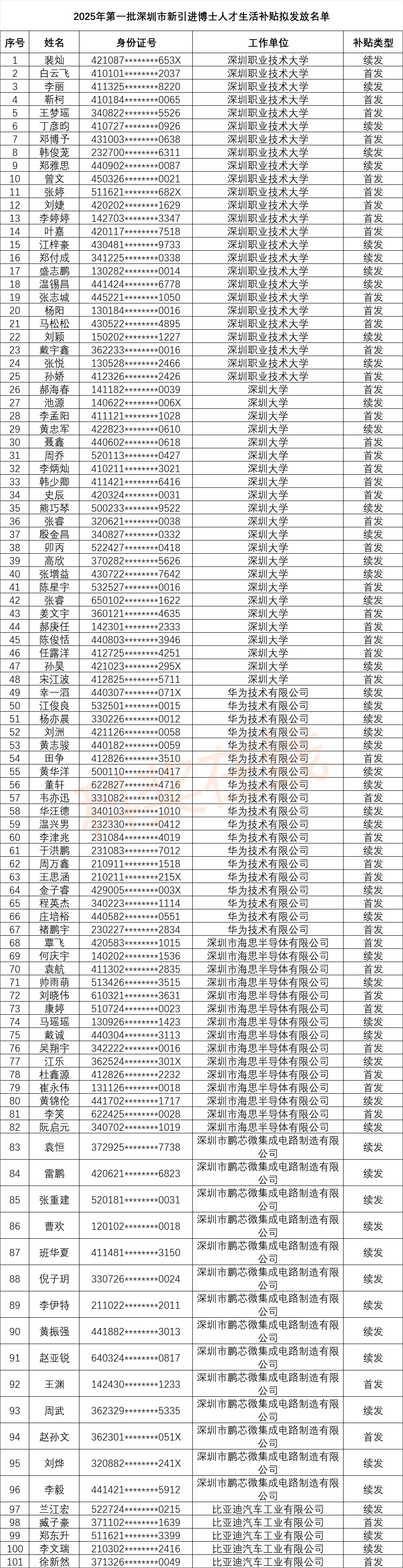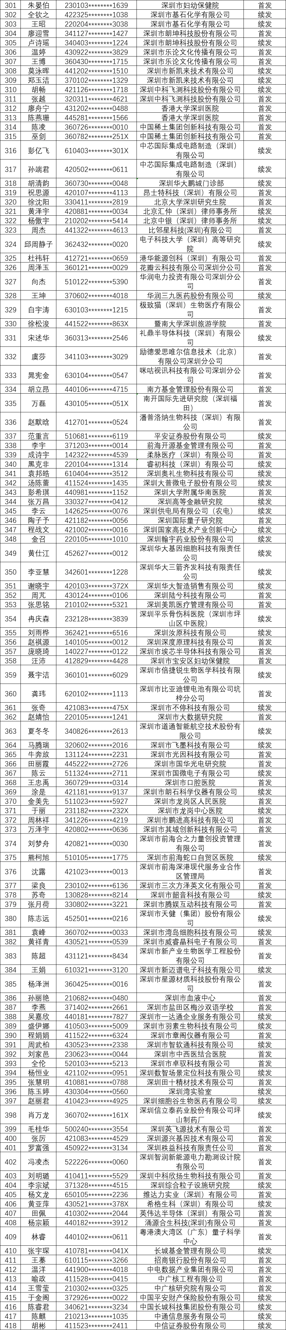 2025年第一批深圳市新引进博士人才生活补贴拟发放名单公示