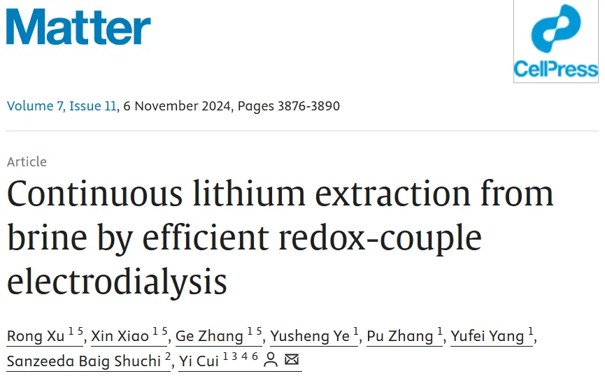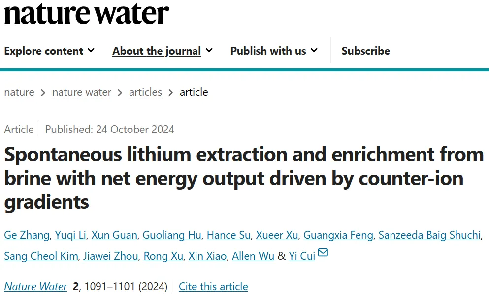 利用HER和HOR实现高能量效率低成本的海水碱化,用于二氧化碳捕捉,对气候变化做贡献,由博士后Xun Guan领衔,论文在PNAS上发表;Seawater alkalization via an energy-efficient electrochemical process for CO2 capture, Proceedings of the National Academy of Science(2024 )https://doi.org/10.1073/pnas.2410841121.不需要外在能量,反而产生电能进行卤水锂元素提纯,巧妙利用了阴离子浓度差提供免费的能量,由博士后Ge Zhang领衔, 论文在Nature Water上发表;Spontaneous lithium extraction and enrichment from brine with net energy output driven by counter-ion gradients. Nature Water (2024). https://doi.org/10.1038/s44221-024-00326-2利用HER和HOR, 固态电解质的锂离子选择性,实现高能量效率低成本在卤水里进行锂元素提纯,由博士后许荣领衔,论文在Matter上发表。Continuous lithium extraction from brine by efficient redox-couple electrodialysis, Matter, 2024, https://doi.org/10.1016/j.matt.2024.07.014.崔屹教授及其课题组的研究方向多种多样,但都时刻保持在相关领域最前沿;研究内容多领域交叉,但都产出着最高水平的科研成果。崔屹教授先后在Science、Nature、Nature Nanotechnology、Nature Materials、Nature Chemistry、Nature Energy、Joule、JACS等世界顶级期刊发表高水平论文700余篇,被引次数20万+,H指数为253。另外,崔屹教授本人也热衷于参加各类相关学术活动和学术会议,担任了国内多所高校的兼职教授,积极与各领域同行同事交流经验、热心学习。最后分享一段崔屹教授的语录:“必须要放下一切问题,摒弃杂念,专注在事情上,不断地往前想,往前做。如果想着你厉害还是我厉害,仅仅这个问题就把自己打败了,根本专注不了。最后,专注到心无旁骛的人才能够胜出。”
