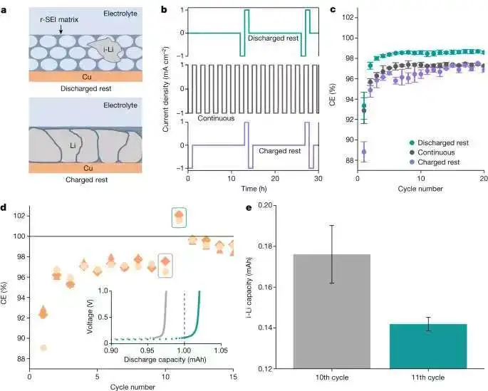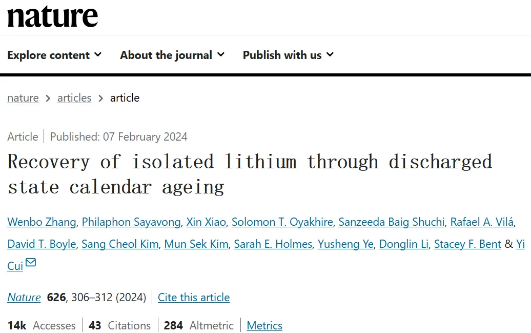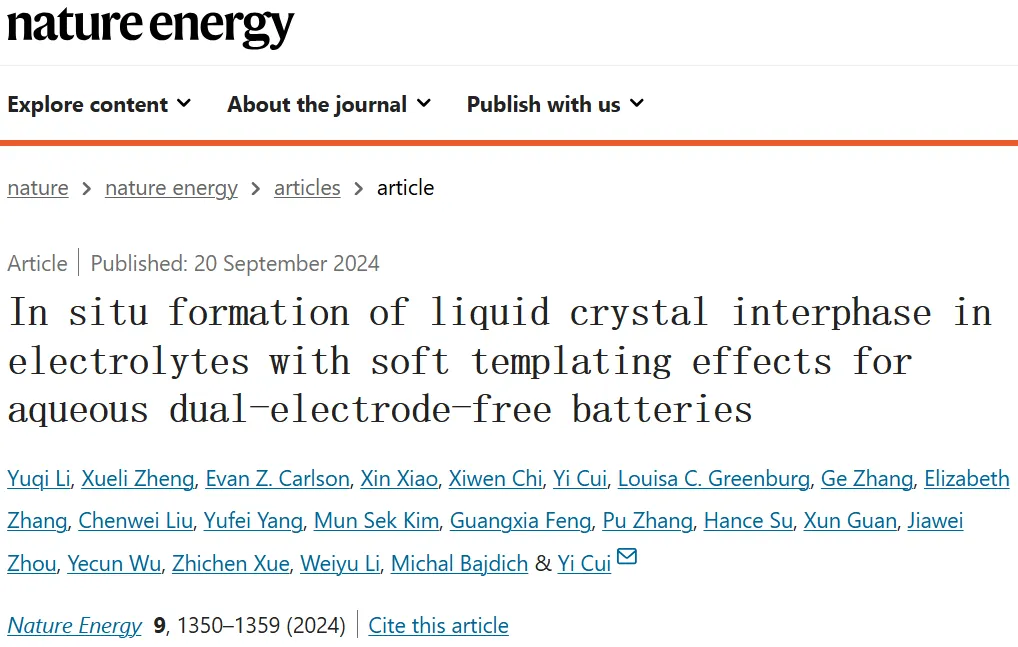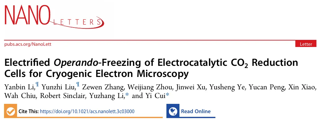In situ formation of liquid crystal interphase in electrolytes with soft templating effects for aqueous dual-electrode-free batteries. Nature Energy, 2024, https://doi.org/10.1038/s41560-024-01638-z.发现金属锂电池在放电态进行休息,可以恢复容量,发现其中机理,对电池寿命的大大增加提供解决方案, 由博士生Wenbo Zhang领衔,论文在Nature 上发表;CE和TGC数据图——说明从放电状态休息的容量恢复Recovery of isolated lithium through discharged state calendar ageing. Nature (2024). https://doi.org/10.1038/s41586-023-06992-8发现交流电泳现象可以用来恢复硅负极的容量,让高能量密度硅负极电池寿命大大延长,由博士生杨羽飞领衔, 论文在Science上发表;Capacity recovery by transient voltage pulse in silicon-anode batteries. Science (2024). DOI:10.1126/science.adn1749冷冻电镜材料领域的又一大突破:崔屹等人在外加电压的条件下,把有电活性的催化剂快速冷冻,发现惊讶的亚稳定态,该方法对材料及生物领域都会产生深远的影响,由博士生李彦彬领衔,论文在Nano Letters上发表;Electrified Operando-Freezing of Electrocatalytic CO2 Reduction Cells for Cryogenic Electron MicroscopyRobert Sinclair, Nano Letters.2024. DOI: 10.1021/acs.nanolett.3c03000发明多孔集流体技术把锂电池充电速度提高4倍,由博士后叶玉胜领衔,论文在Nature Energy上发表;Quadruple the rate capability of high-energy batteries through a porous current collector design. Nature Energy (2024). https://doi.org/10.1038/s41560-024-01473-2高能量密度金属锂电池界面SEI膜形成的机理解析,对寿命和安全性有大的影响,由博士后Weilai Yu领衔,和鲍哲南老师共同指导完成,论文在Nature Chemistry上发表,Weilai Yu即将在多伦多大学开始做教授;