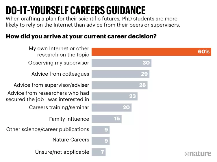 60%的博士找工作,是依靠自己检索网络信息或其他相关研究。图源(《自然》2019博士生调查)