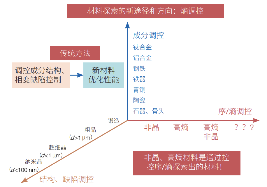 非晶合金是近几十年来通过现代冶金新技术——快速凝固技术和熵调控理念——抑制合金熔体原子的结晶,保持和调控熔体无序结构特征而得到的一类新型金属材料,也称金属玻璃,或液态金属。这种材料是通过调制材料结构“序”或“熵”这一全新途径和理念而合成的,兼具玻璃、金属、固体、液体等物质特性的新金属材料;其颠覆了传统金属材料从成分和缺陷出发设计和制备的思路(图?1),突破金属材料原子结构有序的固有概念,把金属材料的强度、韧性、弹性、抗腐蚀、抗辐照等性能指标提升到前所未有的高度,改变了古老金属结构材料的面貌。非晶、高熵等无序合金在基础研究和技术应用中已表现出重要意义和战略价值,在能源、信息、环保节能、航空航天、医疗卫生和国防等高新技术领域发挥着愈加重要作用。无序合金领域的基础研究将继续推动材料科技革命和对材料行为的更深入理解,并能产生新的材料设备和系统。