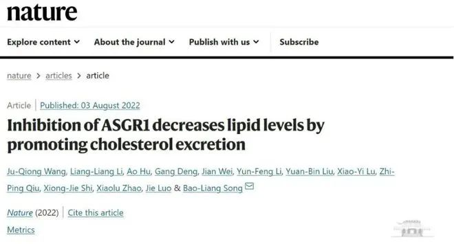 8月3日,中国科学院院士、武汉大学生命科学学院、泰康生命医学中心教授宋保亮实验室在Nature发表题为“Inhibition of ASGR1 decreases lipid levels by promoting cholesterol excretion”(《抑制ASGR1蛋白促使胆固醇外排而降低脂质水平》)的论文,揭示抑制ASGR1蛋白促使胆固醇外排入胆汁,进一步通过粪便排出机体,从而降低血液和肝脏脂质水平,对动脉粥样硬化和脂肪肝有明显疗效。