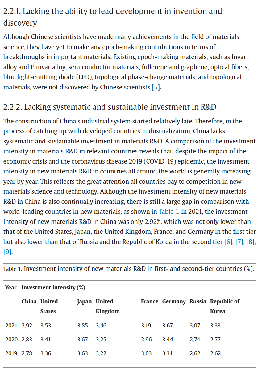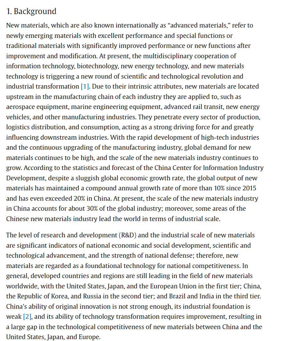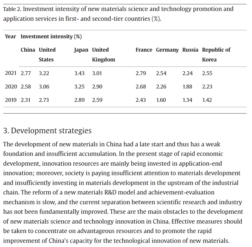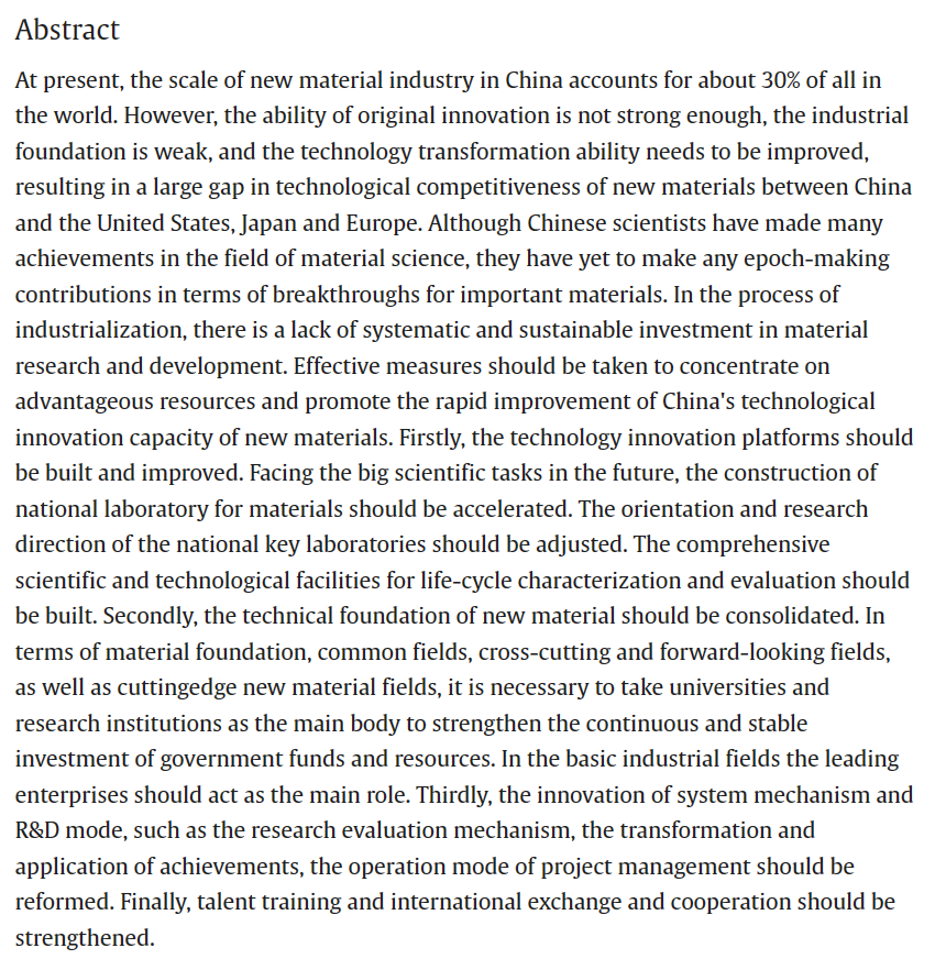 近日,国家新材料产业发展专家咨询委员会主任、中国工程院原副院长干勇院士署名文章《Research on the Innovative Development of New Materials Science and Technology in China》在中国工程院院刊 《Engineering》上发表,文章指出目前我国新材料产业发展和材料研发创新的现状与不足之处,并提出解决问题的思路:采取有力措施整合优势资源,建设完善新材料科技创新平台;加强政府和资源持续流入材料基础、共性技术和交叉、前瞻性技术,推动新材料基础研究和关键技术攻关;同时指出加强产学研协同,加强国际交流合作的重要性,共同推动新材料技术的创新发展。文章内容可点击链接查看原文:https://doi.org/10.1016/j.eng.2023.03.022
