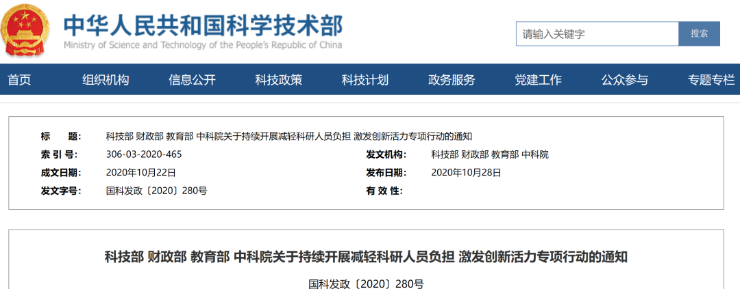 科技部、财政部、教育部、中国科学院先后在2018年12月和2020年10月联合印发了《贯彻落实习近平总书记在两院院士大会上重要讲话精神开展减轻科研人员负担专项行动》(简称“减负行动1.0”)和《关于持续开展减轻科研人员负担,激发创新活力专项行动的通知》(简称“减负行动2.0”)的通知,在全国范围开展减轻科研人员负担的行动。2022年8月,科技部、财政部、教育部、中国科学院、自然科学基金委五部门联合印发了《开展减轻青年科研人员负担专项行动的通知》(减负行动3.0)。