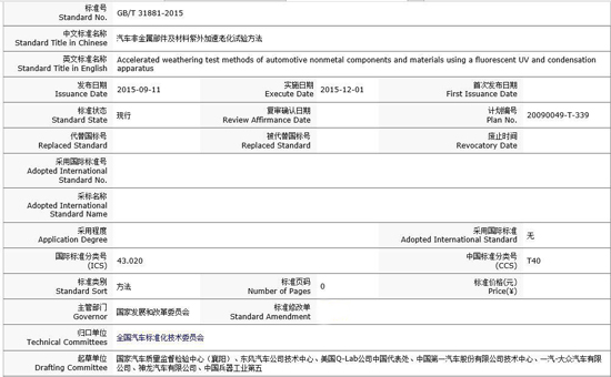 从2009年开始立项,历经6年多的努力,GB/T 31881-2015 《汽车非金属部件及材料紫外加速老化试验方法》国家标准已于2015年9月11日正式发布!