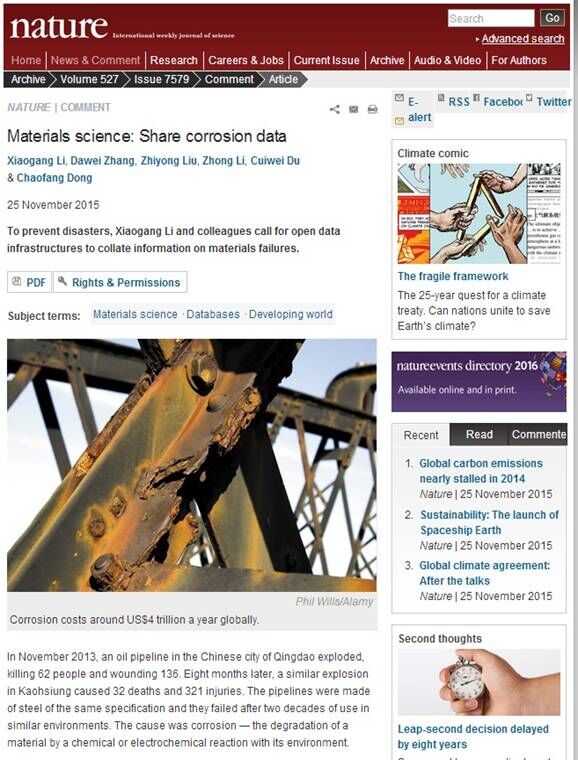 2015年11月26日,材料环境腐蚀平台主任、北京科技大学新材料技术研究院李晓刚教授团队的研究论文“share corrosion data”在世界顶级科技刊物《Nature》(2015,527:441-442)发表。这是北京科技大学在《Nature》刊物上首次发表研究论文,标志着其基础研究再上一个新台阶。据悉,这是我国腐蚀学科,也是世界华人腐蚀研究者首次在《Nature》刊物上发表研究论文。