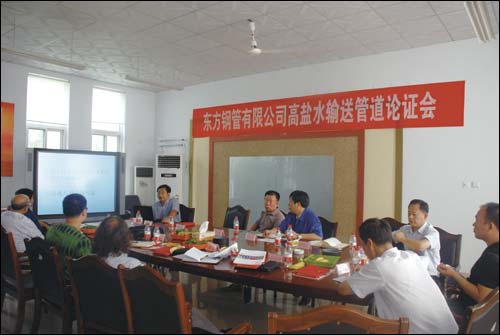 2013年8月27日上午在潍坊东方钢管有限公司新厂区会议室举行了TPEP管道输送高盐水论证会,出席本次论证会的有国家材料环境腐蚀平台主任李晓刚教授,中国科学院沈阳金属研究所张立新研究员,沈阳明科控制腐蚀技术有限公司高学奎董事长,潍坊东方钢管有限公司总经理吴敬胜、副总经理丛悦增以及研发部经理闫吉云、技术中心经理赵明印、孙从征、营销中心经理李玉磊、陈世波等参加。同时邀请了相关项目的业主和设计院领导。