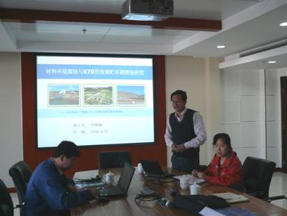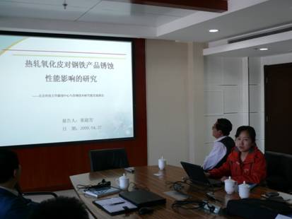 期间李晓刚教授做了“材料环境腐蚀与X70管线钢贮存期锈蚀研究”的技术报告,李教授首先介绍了环境腐蚀站网的工作内容和取得的重要成果,特别是站网在X70管线钢研究方面的工作,报告重点介绍了站网综合中心在X70管线钢贮存期发生锈蚀的机理研究工作,研究结论得到了首钢技术研究院的技术人员充分肯定并表示了很大的兴趣。董超芳副教授做了“热轧氧化皮对钢铁产品锈蚀性能影响的研究”技术报告,介绍了站网综合中心在该领域的研究成果,胡雄光副院长表示研究成果对首钢的的生产有重要的指导意义。随后,站网综合中心的老师和首钢技术研究院的技术人员就首钢在生产过程中出现的各种腐蚀问题进行了热烈的讨论交流。