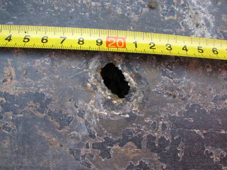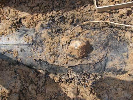 近年来,位于辽宁葫芦岛市的某石油管道企业的管道多次发生局部腐蚀事故,如图所示,给企业的安全生产带来了巨大的隐患,引起了企业的高度重视。为此,该企业聘请腐蚀站网研究中心的专家对其进行现场咨询和原因分析。专家们通过对现场设施与邻近情况分析、现场开挖、腐蚀形貌分析和腐蚀产物分析,给出了引起该腐蚀的原因:局部杂散电流导致埋地管道的局部腐蚀。同时专家门指出了这种腐蚀情况的危害性和有效预防措施。通过两天的现场咨询和研讨,专家们为企业快速解决了实际工程问题,受到企业好评。